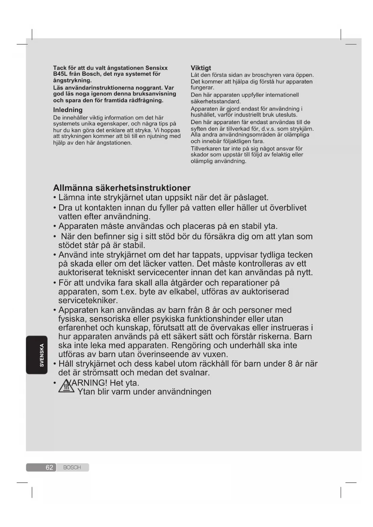 - Trykk på utløseren én gang til, og strykejernet slutter å slippe ut damp umiddelbart. Hvis informasjonen ovenfor ikke løser problemet, må du kontakte et autorisert teknisk servicesenter. DukanlasteneddennebruksanvisningenfraBoschsinelokalenettsider.62 B O S C H SVENSKA TackförattduvaltångstationenSensixx B45LfrånBosch,detnyasystemetför ångstrykning. Läsanvändarinstruktionernanoggrant.Var godläsnogaigenomdennabruksanvisning ochsparadenförframtidarådfrågning. Inledning De innehåller viktig information om det här systemets unika egenskaper, och några tips på hur du kan göra det enklare att stryka. Vi hoppas att strykningen kommer att bli till en njutning med hjälp av den här ångstationen. Viktigt Låt den första sidan av broschyren vara öppen. Det kommer att hjälpa dig förstå hur apparaten fungerar. Den här apparaten uppfyller internationell säkerhetsstandard. Apparaten är gjord endast för användning i hushållet, varför industriellt bruk utesluts. Den här apparaten får endast användas till de syften den är tillverkad för, d.v.s. som strykjärn. Alla andra användningsområden är olämpliga och innebär följaktligen fara. Tillverkaren tar inte på sig något ansvar för skador som uppstår till följd av felaktig eller olämplig användning. Allmännasäkerhetsinstruktioner