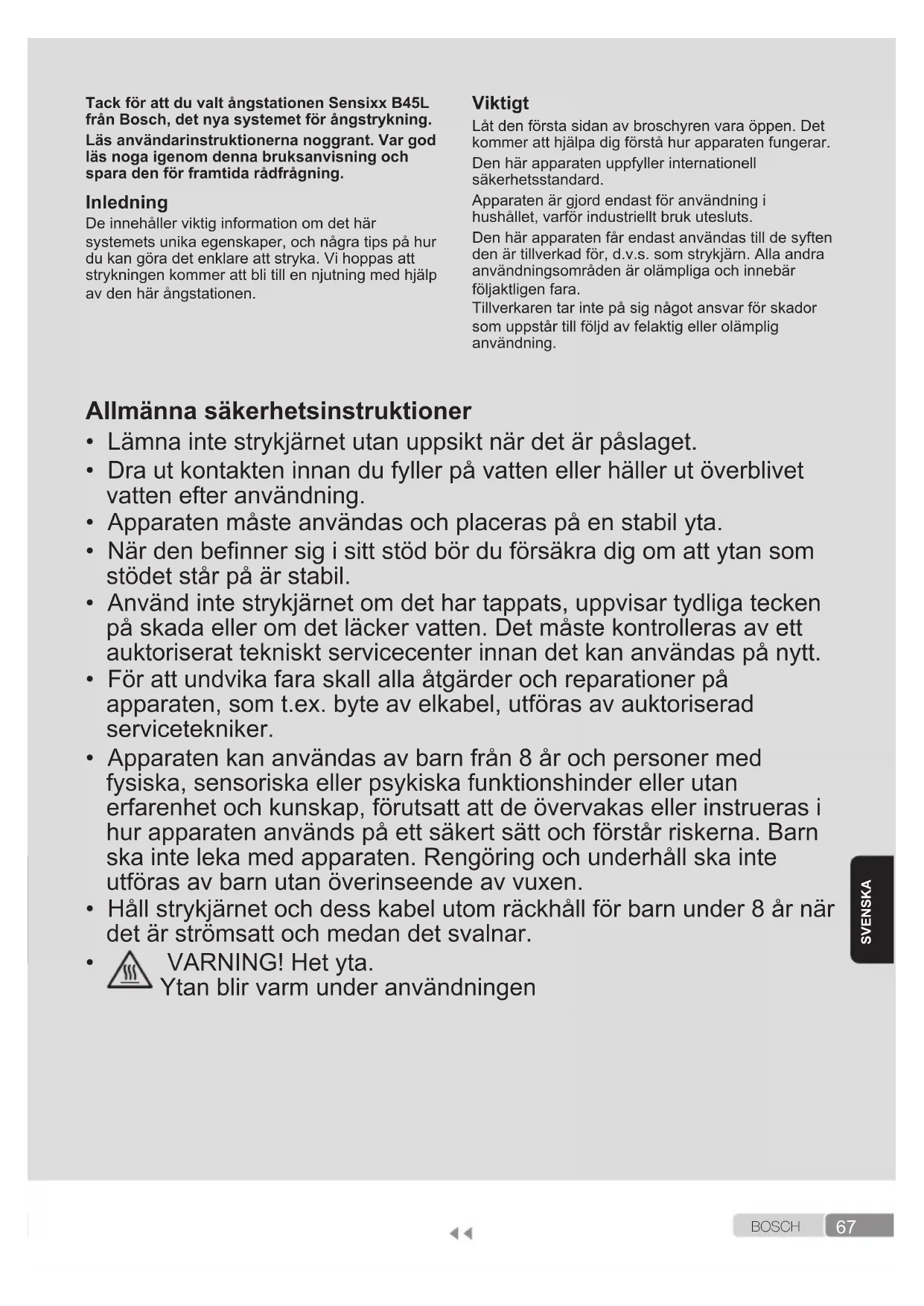Låt den första sidan av broschyren vara öppen. Det kommer att hjälpa dig förstå hur apparaten fungerar. Den här apparaten uppfyller internationell säkerhetsstandard. Apparaten är gjord endast för användning i hushållet, varför industriellt bruk utesluts. Den här apparaten får endast användas till de syften den är tillverkad för, d.v.s. som strykjärn. Alla andra användningsområden är olämpliga och innebär följaktligen fara. Tillverkaren tar inte på sig något ansvar för skador som uppstår till följd av felaktig eller olämplig användning.