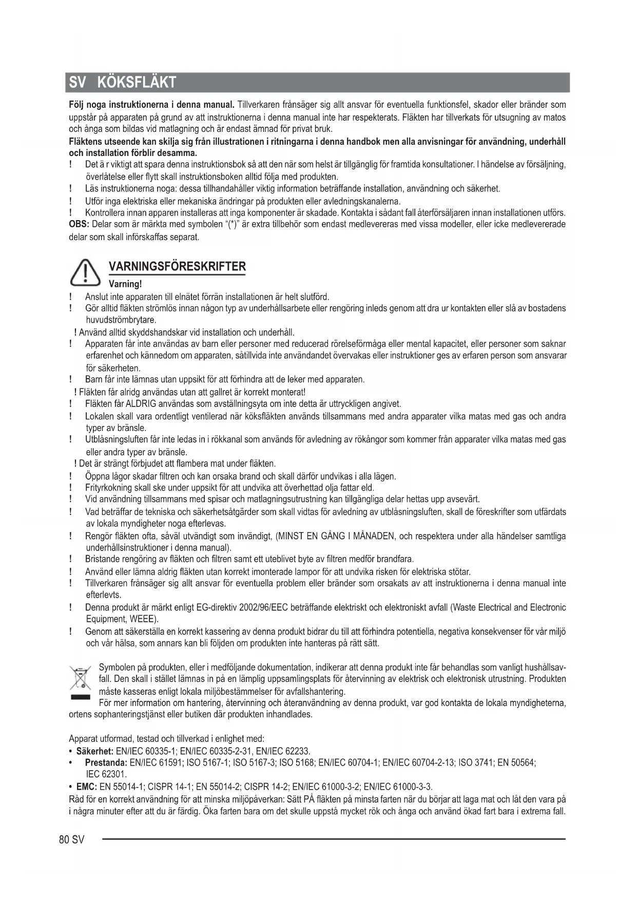 Följ noga instruktionerna i denna manual. Tillverkaren frånsäger sig allt ansvar för eventuella funktionsfel, skador eller bränder som uppstår på apparaten på grund av att instruktionerna i denna manual inte har respekterats. Fläkten har tillverkats för utsugning av matos och ånga som bildas vid matlagning och är endast ämnad för privat bruk. Fläktens utseende kan skilja sig från illustrationen i ritningarna i denna handbok men alla anvisningar för användning, underhåll och installation förblir desamma. ! Det ä r viktigt att spara denna instruktionsbok så att den när som helst är tillgänglig för framtida konsultationer. I händelse av försäljning, överlåtelse eller ytt skall instruktionsboken alltid följa med produkten. ! Läs instruktionerna noga: dessa tillhandahåller viktig information beträffande installation, användning och säkerhet. ! Utför inga elektriska eller mekaniska ändringar på produkten eller avledningskanalerna. ! Kontrollera innan apparen installeras att inga komponenter är skadade. Kontakta i sådant fall återförsäljaren innan installationen utförs. OBS: Delar som är märkta med symbolen “(*)” är extra tillbehör som endast medlevereras med vissa modeller, eller icke medlevererade delar som skall införskaffas separat. VARNINGSFÖRESKRIFTER Varning! ! Anslut inte apparaten till elnätet förrän installationen är helt slutförd. ! Gör alltid äkten strömlös innan någon typ av underhållsarbete eller rengöring inleds genom att dra ur kontakten eller slå av bostadens huvudströmbrytare. ! Använd alltid skyddshandskar vid installation och underhåll. ! Apparaten får inte användas av barn eller personer med reducerad rörelseförmåga eller mental kapacitet, eller personer som saknar erfarenhet och kännedom om apparaten, såtillvida inte användandet övervakas eller instruktioner ges av erfaren person som ansvarar för säkerheten. ! Barn får inte lämnas utan uppsikt för att förhindra att de leker med apparaten. ! Fläkten får alridg användas utan att gallret är korrekt monterat! ! Fläkten får ALDRIG användas som avställningsyta om inte detta är uttryckligen angivet. ! Lokalen skall vara ordentligt ventilerad när köksäkten används tillsammans med andra apparater vilka matas med gas och andra typer av bränsle. ! Utblåsningsluften får inte ledas in i rökkanal som används för avledning av rökångor som kommer från apparater vilka matas med gas eller andra typer av bränsle. ! Det är strängt förbjudet att ambera mat under äkten. ! Öppna lågor skadar ltren och kan orsaka brand och skall därför undvikas i alla lägen. ! Frityrkokning skall ske under uppsikt för att undvika att överhettad olja fattar eld. ! Vid användning tillsammans med spisar och matlagningsutrustning kan tillgängliga delar hettas upp avsevärt. ! Vad beträffar de tekniska och säkerhetsåtgärder som skall vidtas för avledning av utblåsningsluften, skall de föreskrifter som utfärdats av lokala myndigheter noga efterlevas. ! Rengör äkten ofta, såväl utvändigt som invändigt, (MINST EN GÅNG I MÅNADEN, och respektera under alla händelser samtliga underhållsinstruktioner i denna manual). ! Bristande rengöring av äkten och ltren samt ett uteblivet byte av ltren medför brandfara. ! Använd eller lämna aldrig äkten utan korrekt imonterade lampor för att undvika risken för elektriska stötar. ! Tillverkaren frånsäger sig allt ansvar för eventuella problem eller bränder som orsakats av att instruktionerna i denna manual inte efterlevts. ! Denna produkt är märkt enligt EG-direktiv 2002/96/EEC beträffande elektriskt och elektroniskt avfall (Waste Electrical and Electronic Equipment, WEEE). ! Genom att säkerställa en korrekt kassering av denna produkt bidrar du till att förhindra potentiella, negativa konsekvenser för vår miljö och vår hälsa, som annars kan bli följden om produkten inte hanteras på rätt sätt. Symbolen på produkten, eller i medföljande dokumentation, indikerar att denna produkt inte får behandlas som vanligt hushållsav- fall. Den skall i stället lämnas in på en lämplig uppsamlingsplats för återvinning av elektrisk och elektronisk utrustning. Produkten måste kasseras enligt lokala miljöbestämmelser för avfallshantering. För mer information om hantering, återvinning och återanvändning av denna produkt, var god kontakta de lokala myndigheterna, ortens sophanteringstjänst eller butiken där produkten inhandlades. Apparat utformad, testad och tillverkad i enlighet med: