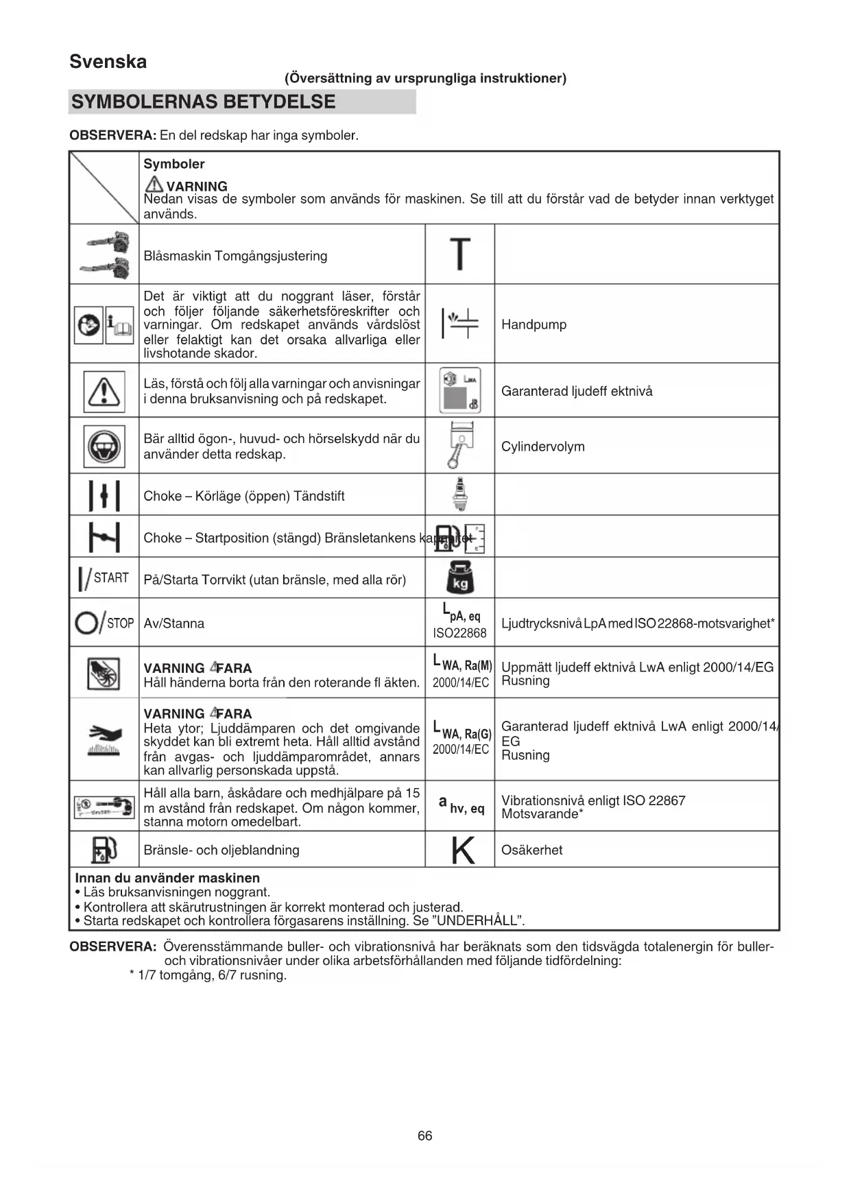 (Översättning av ursprungliga instruktioner) SYMBOLERNAS BETYDELSE OBSERVERA: En del redskap har inga symboler. Symboler VARNING Nedan visas de symboler som används för maskinen. Se till att du förstår vad de betyder innan verktyget används. Blåsmaskin Tomgångsjustering Det är viktigt att du noggrant läser, förstår och följer följande säkerhetsföreskrifter och varningar. Om redskapet används vårdslöst eller felaktigt kan det orsaka allvarliga eller livshotande skador. Handpump Läs, förstå och följ alla varningar och anvisningar i denna bruksanvisning och på redskapet. Garanterad ljudeff ektnivå Bär alltid ögon-, huvud- och hörselskydd när du använder detta redskap. Cylindervolym Choke – Körläge (öppen) Tändstift Choke – Startposition (stängd) Bränsletankens kapacitet START På/Starta Torrvikt (utan bränsle, med alla rör) STOP Av/Stanna