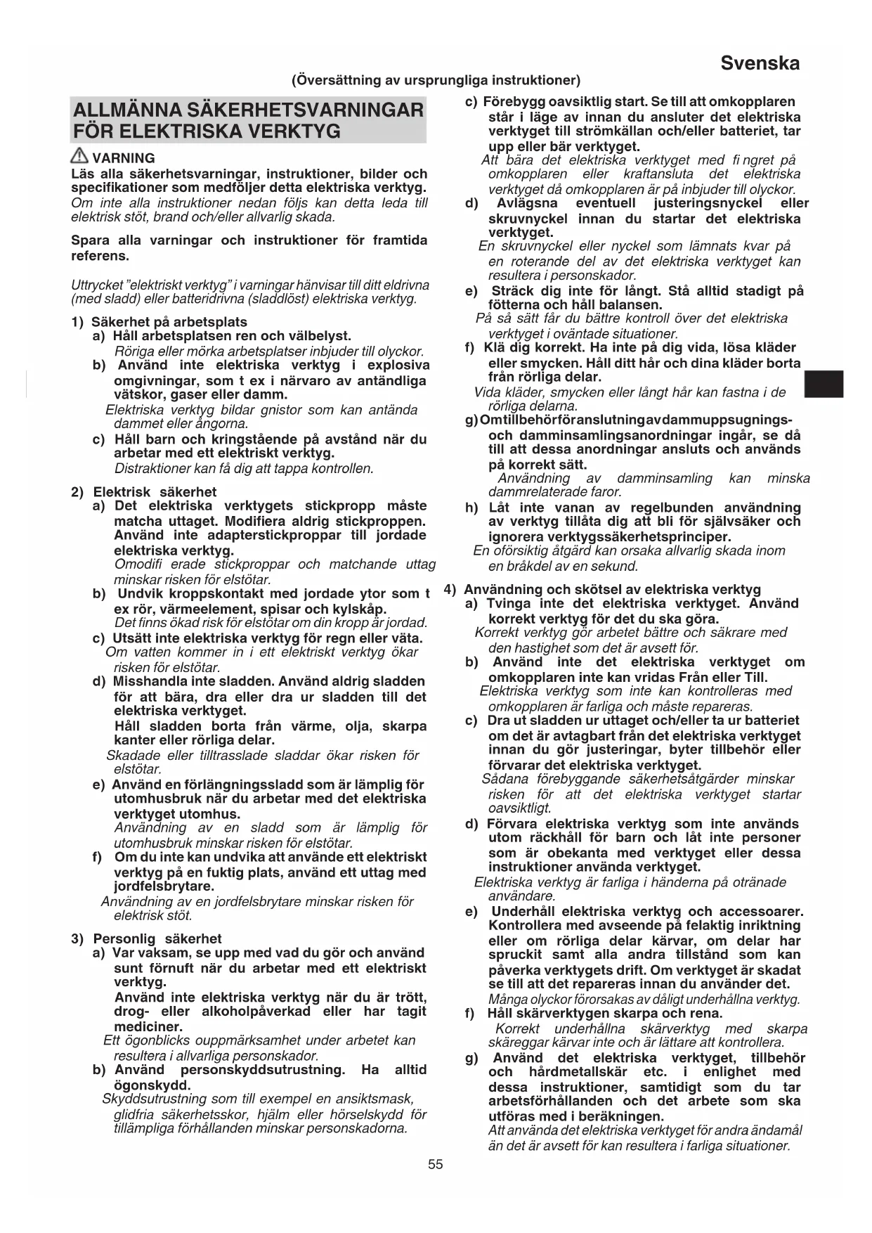 VARNING Läs alla säkerhetsvarningar, instruktioner, bilder och specifi kationer som medföljer detta elektriska verktyg. Om inte alla instruktioner nedan följs kan detta leda till elektrisk stöt, brand och/eller allvarlig skada. Spara alla varningar och instruktioner för framtida referens. Uttrycket ”elektriskt verktyg” i varningar hänvisar till ditt eldrivna (med sladd) eller batteridrivna (sladdlöst) elektriska verktyg.