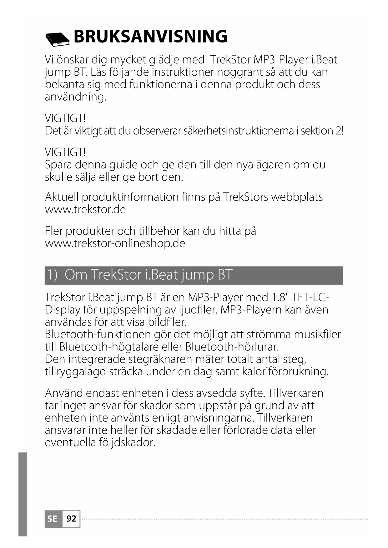 TrekStor i.Beat jump BT är en MP3-Player med 1.8" TFT-LC- Display för uppspelning av ljudfiler. MP3-Playern kan även användas för att visa bildfiler. Bluetooth-funktionen gör det möjligt att strömma musikfiler till Bluetooth-högtalare eller Bluetooth-hörlurar. Den integrerade stegräknaren mäter totalt antal steg, tillryggalagd sträcka under en dag samt kaloriförbrukning. Använd endast enheten i dess avsedda syfte. Tillverkaren tar inget ansvar för skador som uppstår på grund av att enheten inte använts enligt anvisningarna. Tillverkaren ansvarar inte heller för skadade eller förlorade data eller eventuella följdskador.SE