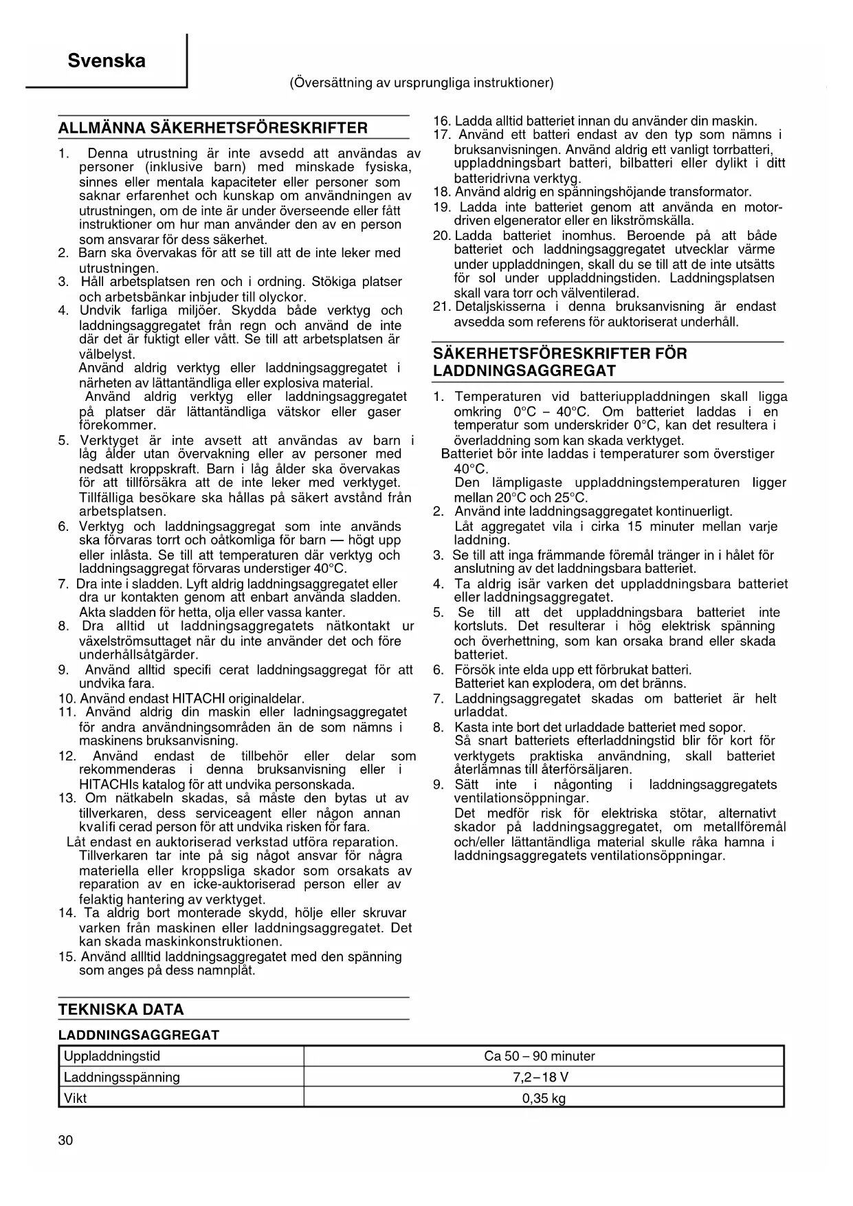 ventilationsöppningar. Det medför risk för elektriska stötar, alternativt skador på laddningsaggregatet, om metallföremål och/eller lättantändliga material skulle råka hamna i laddningsaggregatets ventilationsöppningar. (Översättning av ursprungliga instruktioner) TEKNISKA DATA LADDNINGSAGGREGAT Uppladdningstid Ca 50 – 90 minuter Laddningsspänning 7,2 – 18 V Vikt 0,35 kg 000BookUC18YKWE+NE.indb30000BookUC18YKWE+NE.indb30 2010/02/0118:15:322010/02/0118:15:3231 Svenska