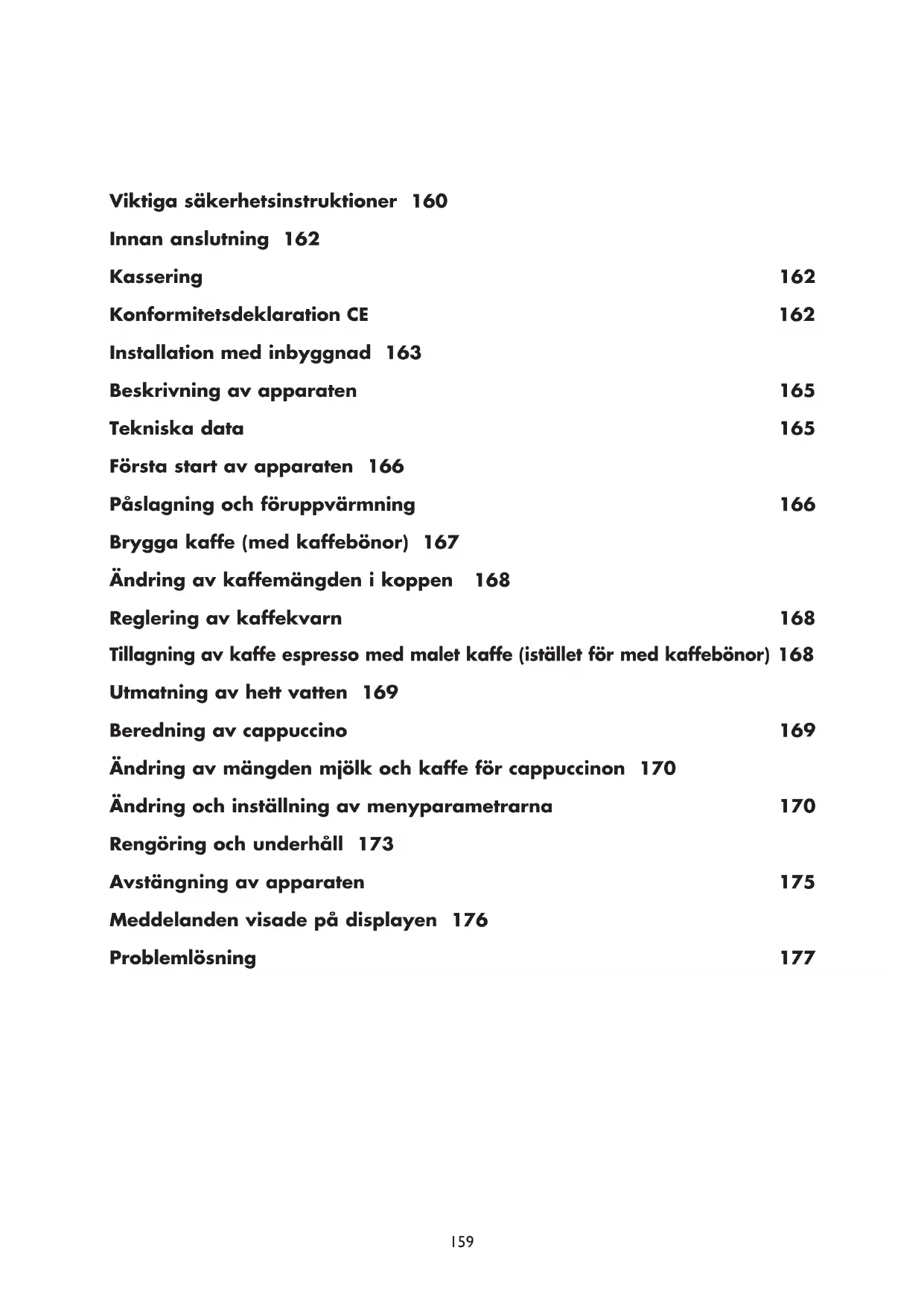 Utmatning av hett vatten 169 Beredning av cappuccino 169 Ändring av mängden mjölk och kaffe för cappuccinon 170 Ändring och inställning av menyparametrarna 170 Rengöring och underhåll 173 Avstängning av apparaten 175 Meddelanden visade på displayen 176 Problemlösning 177 159Viktiga säkerhetsinstruktioner