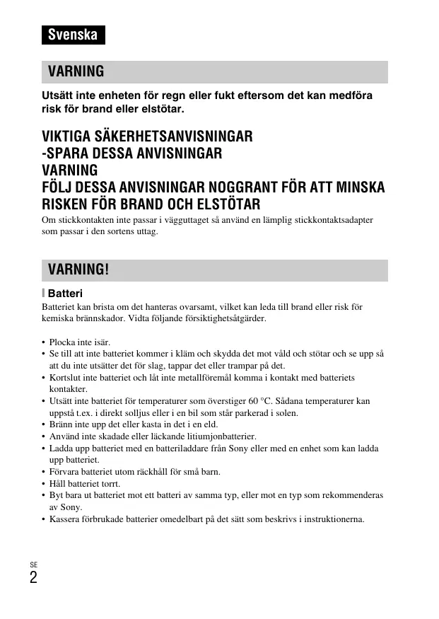 Svenska VARNING Utsätt inte enheten för regn eller fukt eftersom det kan medföra risk för brand eller elstötar.