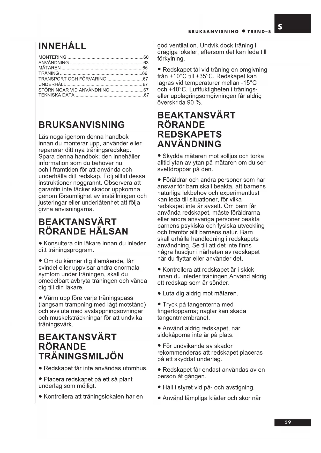 TEKNISKA DATA ......................................................67 god ventilation. Undvik dock träning i dragiga lokaler, eftersom det kan leda till förkylning.