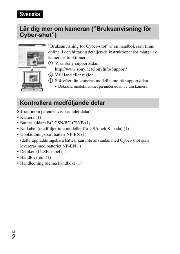 Svenska Lär dig mer om kameran (”Bruksanvisning för Cyber-shot”) ”Bruksanvisning för Cyber-shot” är en handbok som finns online. I den hittar du detaljerade instruktioner för många av kamerans funktioner. 1 Visa Sony-supportsidan. http://www.sony.net/SonyInfo/Support/ 2 Välj land eller region. 3 Sök efter din kameras modellnamn på supportsidan.