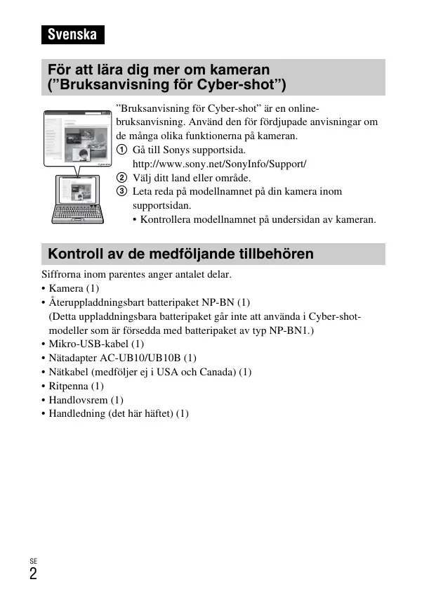 Svenska För att lära dig mer om kameran (”Bruksanvisning för Cyber-shot”) ”Bruksanvisning för Cyber-shot” är en onlinebruksanvisning. Använd den för fördjupade anvisningar om de många olika funktionerna på kameran. 1 Gå till Sonys supportsida. http://www.sony.net/SonyInfo/Support/ 2 Välj ditt land eller område. 3 Leta reda på modellnamnet på din kamera inom supportsidan.