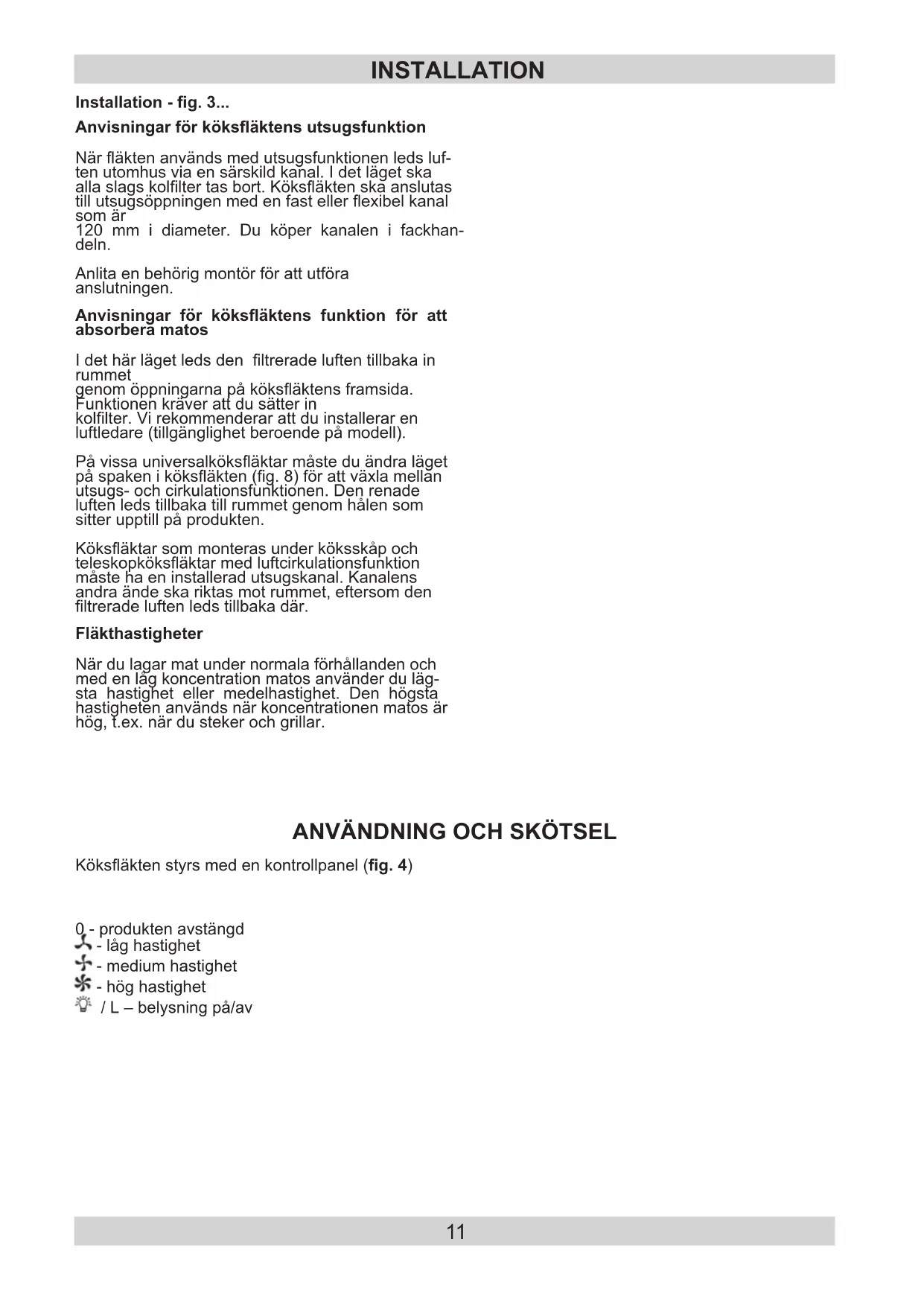 l Tillverkaren övertar in- get ansvar för skador som uppstår på grund av felaktig installation eller om köksäkten inte används enligt an- visningarna i denna ma- nual. l Köksäkten är avsedd för att avlägsna matos. Använd inte köksäkten för andra ändamål. l Anslut en köksäkt med utsugsfunktion till en passande ventila- tionskanal (anslut INTE till rök- eller rökgaska- naler som används). Det krävs att en luftut- sugskanal som leder utomhus installeras. Ka- nalen (i regel 120 eller 150 mm i diameter) bör inte vara längre än 4–5 m. En luftutsugskanal krävs även för köksäk- tar i teleskoputförande eller äktar som mon- teras under köksskåp om dessa är luftcirkula- tionsäktar. l Köksäktar med luftcirkulationsfunktion måste ha ett installerat aktivkollter. I så fall be- hövs ingen utsugskanal, men vi rekommenderar att du installerar en lu- ftledare (endast köks- äkt av skorstenstyp).