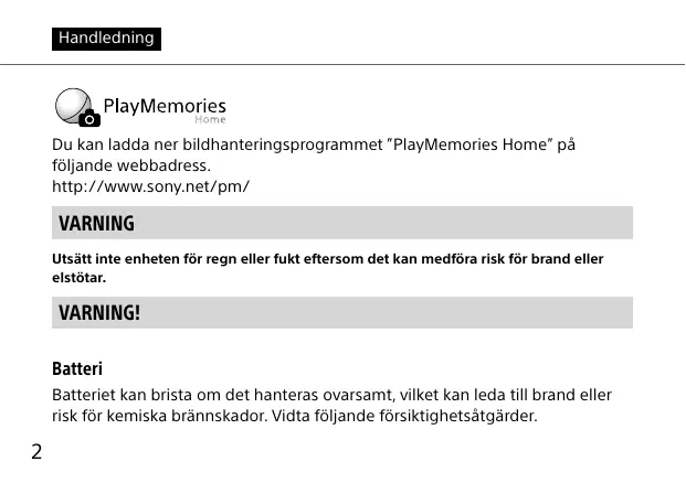 Handledning Du kan ladda ner bildhanteringsprogrammet ”PlayMemories Home” på följande webbadress. http://www.sony.net/pm/ VARNING Utsätt inte enheten för regn eller fukt eftersom det kan medföra risk för brand eller elstötar. VARNING! Batteri Batteriet kan brista om det hanteras ovarsamt, vilket kan leda till brand eller risk för kemiska brännskador. Vidta följande försiktighetsåtgärder.