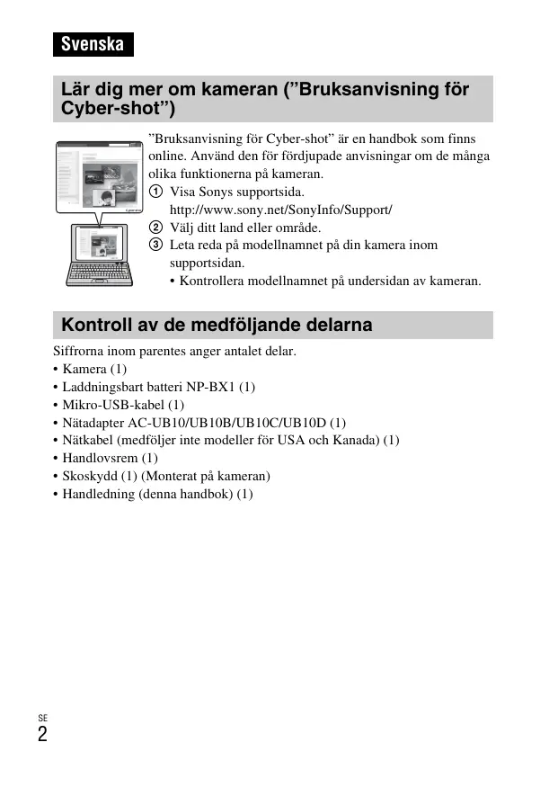 Svenska Lär dig mer om kameran (”Bruksanvisning för Cyber-shot”) ”Bruksanvisning för Cyber-shot” är en handbok som finns online. Använd den för fördjupade anvisningar om de många olika funktionerna på kameran. 1 Visa Sonys supportsida. http://www.sony.net/SonyInfo/Support/ 2 Välj ditt land eller område. 3 Leta reda på modellnamnet på din kamera inom supportsidan.