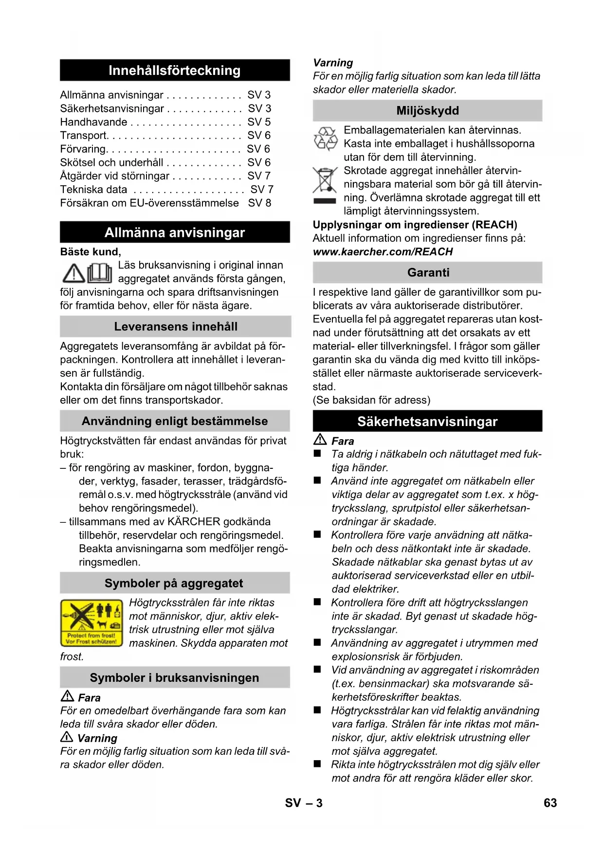91 dB(A) 61NO– 8 Vi erklærer hermed at maskinen angitt nedenfor oppfyller de grunnleggende sikkerhets- og hel- sekravene i de relevante EF-direktivene, med hensyn til både design, konstruksjon og type markedsført av oss. Ved endringer på maskinen som er utført uten vårt samtykke, mister denne erklæringen sin gyldighet. De undertegnede handler på oppdrag fra, og med fullmakt fra selskapsledelsen. Dokumentasjonsansvarlig: S. Reiser Alfred Kärcher GmbH & Co. KG Alfred-Kärcher-Str. 28 - 40 71364 Winnenden (Germany) Tlf: +49 7195 14-0 Faks: +49 7195 14-2212 EU-samsvarserklæring Produkt: Høytrykksvasker Type: 1.673-xxx Relevante EU-direktiver 2006/42/EF (+2009/127/EF) 2004/108/EF 2000/14/EF 2011/65/EF Anvendte overensstemmende normer EN 50581 EN 55014–1: 2006+A1: 2009+A2: 2011 EN 55014–2: 1997+A1: 2001+A2: 2008 EN 60335–1 EN 60335–2–79 EN 61000–3–2: 2006+A1: 2009+A2: 2009 EN 61000–3–3: 2008 EN 62233: 2008 Anvendt metode for samsvarsvurdering 2000/14/EF: Vedlegg V Lydeffektnivå dB(A) Målt: 89 Garantert: 91 Winnenden, 2012/11/01 CEO Head of Approbation 62 NO– 3 Bäste kund, Läs bruksanvisning i original innan aggregatet används första gången, följ anvisningarna och spara driftsanvisningen för framtida behov, eller för nästa ägare. Aggregatets leveransomfång är avbildat på för- packningen. Kontrollera att innehållet i leveran- sen är fullständig. Kontakta din försäljare om något tillbehör saknas eller om det finns transportskador. Högtryckstvätten får endast användas för privat bruk: – för rengöring av maskiner, fordon, byggna- der, verktyg, fasader, terasser, trädgårdsfö- remål o.s.v. med högtrycksstråle (använd vid behov rengöringsmedel). – tillsammans med av KÄRCHER godkända tillbehör, reservdelar och rengöringsmedel. Beakta anvisningarna som medföljer rengö- ringsmedlen. Högtrycksstrålen får inte riktas mot människor, djur, aktiv elek- trisk utrustning eller mot själva maskinen. Skydda apparaten mot frost. Fara För en omedelbart överhängande fara som kan leda till svåra skador eller döden. 몇 Varning För en möjlig farlig situation som kan leda till svå- ra skador eller döden. Varning För en möjlig farlig situation som kan leda till lätta skador eller materiella skador. Emballagematerialen kan återvinnas. Kasta inte emballaget i hushållssoporna utan för dem till återvinning. Skrotade aggregat innehåller återvin- ningsbara material som bör gå till återvin- ning. Överlämna skrotade aggregat till ett lämpligt återvinningssystem. Upplysningar om ingredienser (REACH) Aktuell information om ingredienser finns på: www.kaercher.com/REACH I respektive land gäller de garantivillkor som pu- blicerats av våra auktoriserade distributörer. Eventuella fel på aggregatet repareras utan kost- nad under förutsättning att det orsakats av ett material- eller tillverkningsfel. I frågor som gäller garantin ska du vända dig med kvitto till inköps- stället eller närmaste auktoriserade serviceverk- stad. (Se baksidan för adress) Fara Ta aldrig i nätkabeln och nätuttaget med fuk- tiga händer. Använd inte aggregatet om nätkabeln eller viktiga delar av aggregatet som t.ex. x hög- trycksslang, sprutpistol eller säkerhetsan- ordningar är skadade. Kontrollera före varje anvädning att nätka- beln och dess nätkontakt inte är skadade. Skadade nätkablar ska genast bytas ut av auktoriserad serviceverkstad eller en utbil- dad elektriker. Kontrollera före drift att högtrycksslangen inte är skadad. Byt genast ut skadade hög- trycksslangar. Användning av aggregatet i utrymmen med explosionsrisk är förbjuden. Vid användning av aggregatet i riskområden (t.ex. bensinmackar) ska motsvarande sä- kerhetsföreskrifter beaktas. Högtrycksstrålar kan vid felaktig användning vara farliga. Strålen får inte riktas mot män- niskor, djur, aktiv elektrisk utrustning eller mot själva aggregatet. Rikta inte högtrycksstrålen mot dig själv eller mot andra för att rengöra kläder eller skor. Innehållsförteckning Allmänna anvisningar . . . . . . . . . . . . . SV 3 Säkerhetsanvisningar . . . . . . . . . . . . . SV 3 Handhavande . . . . . . . . . . . . . . . . . . . SV 5 Transport. . . . . . . . . . . . . . . . . . . . . . . SV 6 Förvaring. . . . . . . . . . . . . . . . . . . . . . . SV 6 Skötsel och underhåll . . . . . . . . . . . . . SV 6 Åtgärder vid störningar . . . . . . . . . . . . SV 7 Tekniska data . . . . . . . . . . . . . . . . . . . SV 7 Försäkran om EU-överensstämmelse SV 8 Allmänna anvisningar Leveransens innehåll Användning enligt bestämmelse Symboler på aggregatet Symboler i bruksanvisningen Miljöskydd Garanti Säkerhetsanvisningar 63SV– 4 Spruta aldrig på föremål som innehåller häl- sovådliga ämnen (t.ex. asbest). Däck eller däckventiler kan skadas och gå sönder av högtrycksstrålen. Första tecknet är att däcket missfärgas. Skadade däck/ däckventiler kan innebära livsfara. Håll minst 30 cm strålavstånd vid rengöring! Risk för explosion! Inga brännbara vätskor får fördelas med högtryckstvätten. Sug aldrig upp vätskor som innehåller lös- ningsmedel eller outspädda syror och lös- ningsmedel! Hit räknas bl.a. bensin, tinner eller eldningsolja. Ångan är lättantändlig, ex- plosiv och giftig. Använd inte aceton, out- spädda syror och lösningsmedel eftersom de angriper de material som använts i aggre- gatet. 몇 Varning Nätkontakt och kopplingar på förlängnings- ledningar måste vara vattentäta och får ej ligga i vatten. Olämpliga förlängningskablar kan vara farli- ga. Använd endast tillåtna förlängningskab- lar utomhus, med motsvarande märkning och med tillräckligt tvärsnitt.