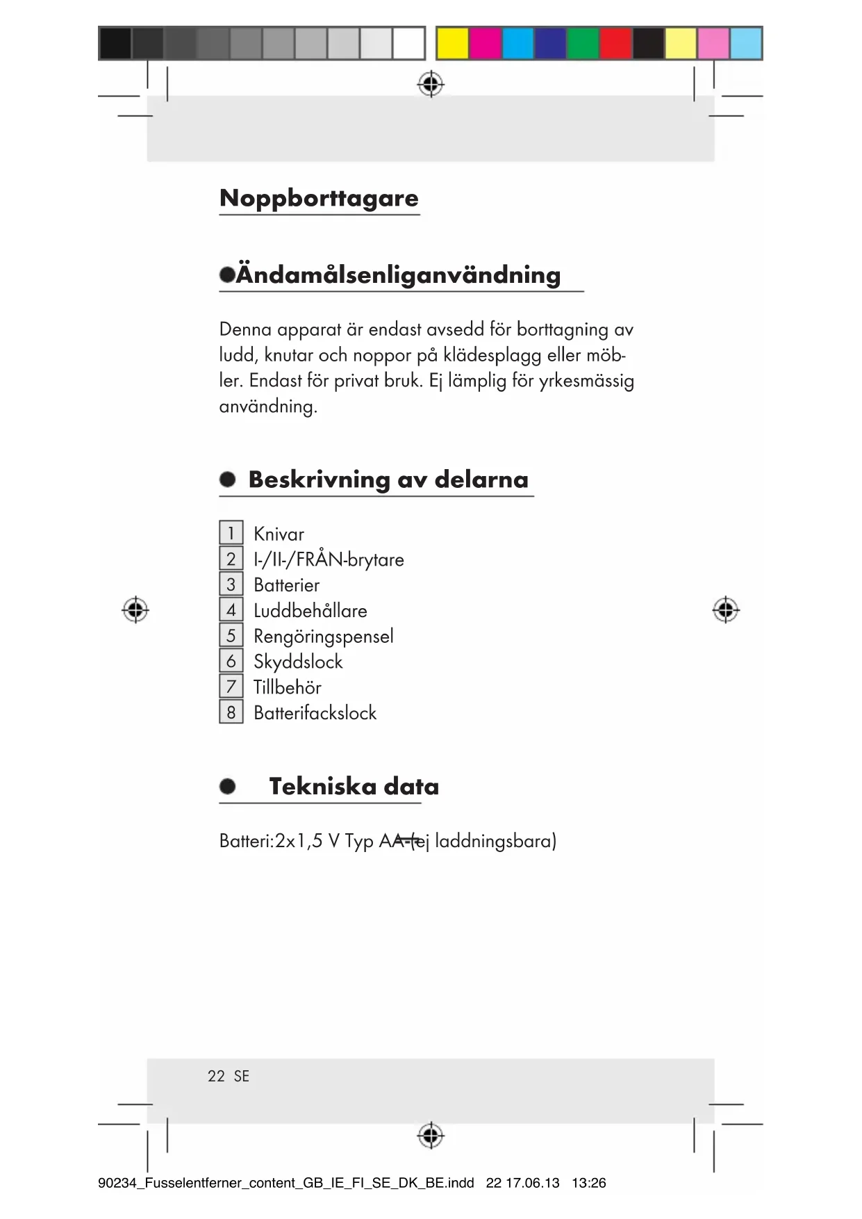 Batterifackslock Tekniska data Batteri: 2 x 1,5V Typ AA (ej laddningsbara) 90234_Fusselentferner_content_GB_IE_FI_SE_DK_BE.indd 22 17.06.13 13:2623 SE Säkerhetsinformation LÄS BRUKSANVISNINGEN FÖRE ANVÄND- NING! FÖRVARA BRUKSANVISNINGEN NOGA! SE UPP! RISK FÖR PERSONSKADOR! Barn ska hållas under uppsikt och får absolut inte använda apparaten som leksak. Denna apparat kan användas av barn från och med 8 år samt av personer med nedsatt fysisk, motorisk eller mental förmåga eller med bristande erfarenhet och kunskap, om de hålls under upp- sikt eller instruerats om en säker användning av apparaten och om de förstått de risker som användningen kan medföra. Barn får inte leka med apparaten. Rengöring och underhåll får inte utföras av barn utan uppsikt av vuxen person. Använd inte apparaten med borttagen luddbe- hållare. Stoppa inte fingrarna i knivarna under använd- ning! Använd aldrig apparaten med skadade knivar. Tryck aldrig hårt på knivarna under använd- ningen. Var försiktigt när du använder apparaten – Risk för personskador, p.g.a. skarpa skärblad! 90234_Fusselentferner_content_GB_IE_FI_SE_DK_BE.indd 23 17.06.13 13:2624 SE Säkerhetsinformation om batterier EXPLOSIONSRISK! Försök aldrig att ladda engångsbatterier, kortslut och / eller öppna dem inte. Följden kan bli överhettning, brandfara eller spruckna batterier. Kasta aldrig batterier i öppen eld eller vatten. Batterierna kan explodera. EXPLOSIONSRISK! Explosionsrisk föreligger om batteriet byts på felak- tigt sätt. Ersätt de tomma batterierna med 2 nya batterier av samma typ (1,5 V AA). Stäng av (FRÅN) apparaten innan du sätter i batterier. Använd endast angiven batterityp. Sätt i batterierna, kontrollera att polerna ligger korrekt i batterifacket (+ och –). Kontrollera regelbundet om batterierna läcker. Ta bort förbrukade batterier ur apparaten ome- delbart, annars kan det hända att batterierna djupurladdas. Risk för läckage föreligger. Om batterierna i din apparatt läcker, ta ut dem ome- delbart för att förhindra skador på apparaten. Läckande eller skadade batterier kan förorsaka frätskador, när de kommer i kontakt med huden. Använd därför i ett sådant fall alltid lämpliga skyddshandskar! Ta ur batterierna ur apparaten om den inte skall användas under en längre tid. Anslutningspolerna får under inga omständighe- ter kortslutas. 90234_Fusselentferner_content_GB_IE_FI_SE_DK_BE.indd 24 17.06.13 13:2625 SE Isättning av batterier För isättning resp. byte av batterierna följ anvis- ningarna på bilderna B och C. Idrifttagning Lägg klädesplagget platt på ett jämnt och rent underlag. OBS! Luddborttagaren kan skada strukturerade och mycket mjuka tyger som t.ex. angora. För att undvika skador testa apparaten och de olika höjdinställningarna på ett inte iögonfallande ställe före användning. Knivarna får varken oljas eller smörjas! Risk före- ligger att dina kläder blir smutsiga. Slå på apparaten, genom att föra fram I-/II-/ FRÅN-brytaren
