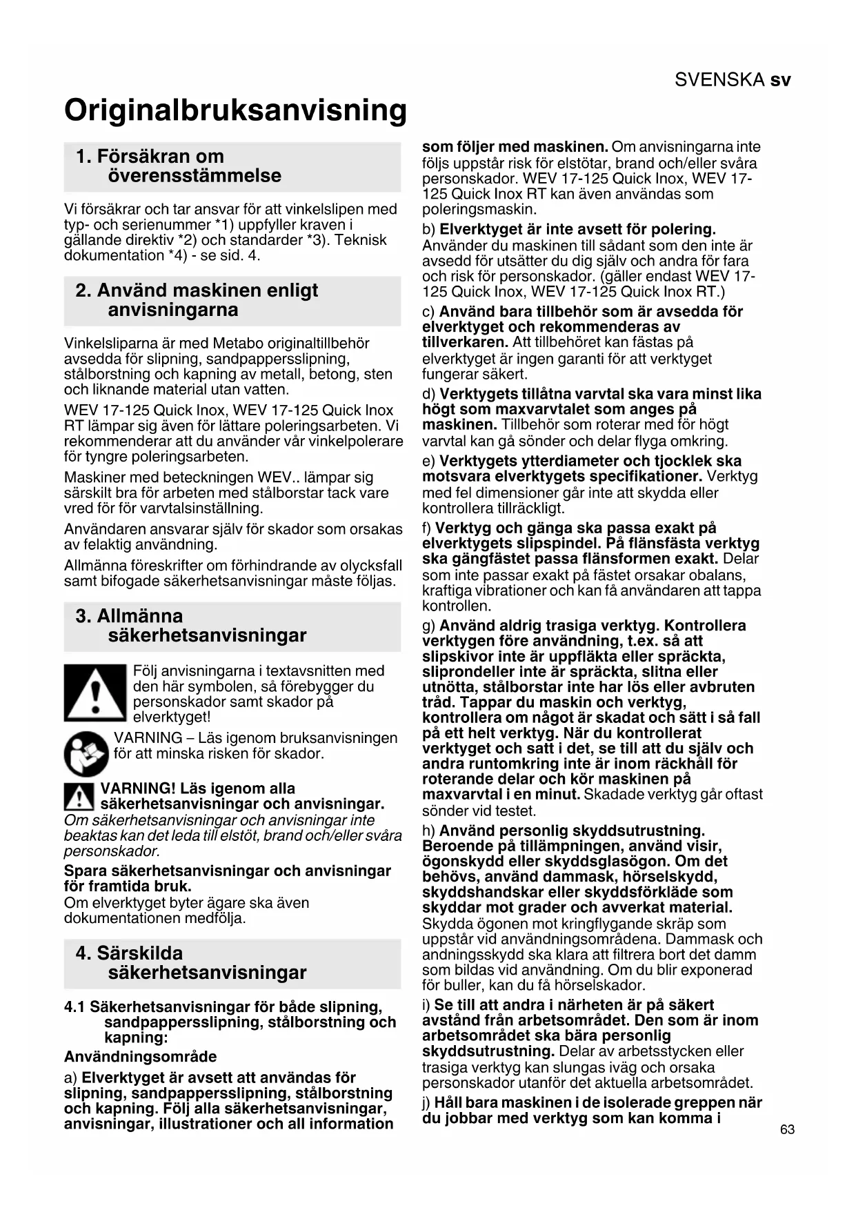 Originalbruksanvisning Vi försäkrar och tar ansvar för att vinkelslipen med typ- och serienummer *1) uppfyller kraven i gällande direktiv *2) och standarder *3). Teknisk dokumentation *4) - se sid. 4. Vinkelsliparna är med Metabo originaltillbehör avsedda för slipning, sandpappersslipning, stålborstning och kapning av metall, betong, sten och liknande material utan vatten. WEV 17-125 Quick Inox, WEV 17-125 Quick Inox RT lämpar sig även för lättare poleringsarbeten. Vi rekommenderar att du använder vår vinkelpolerare för tyngre poleringsarbeten. Maskiner med beteckningen WEV.. lämpar sig särskilt bra för arbeten med stålborstar tack vare vred för för varvtalsinställning. Användaren ansvarar själv för skador som orsakas av felaktig användning. Allmänna föreskrifter om förhindrande av olycksfall samt bifogade säkerhetsanvisningar måste följas. Följ anvisningarna i textavsnitten med den här symbolen, så förebygger du personskador samt skador på elverktyget! VARNING – Läs igenom bruksanvisningen för att minska risken för skador. VARNING! Läs igenom alla säkerhetsanvisningar och anvisningar. Om säkerhetsanvisningar och anvisningar inte beaktas kan det leda till elstöt, brand och/eller svåra personskador. Spara säkerhetsanvisningar och anvisningar för framtida bruk. Om elverktyget byter ägare ska även dokumentationen medfölja.