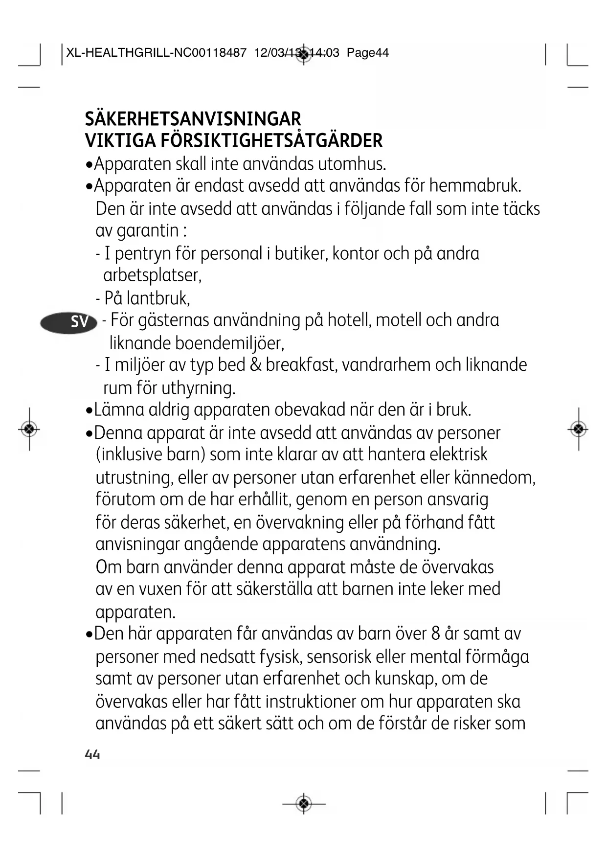 XL-HEALTHGRILL-NC00118487 12/03/13 14:03 Page44föreligger. Barn får inte leka med apparaten. Rengöring och användarunderhåll får göras av barn om de är över 8 år och det sker under ansvarigs tillsyn. Förvara apparaten och sladden utom räckhåll för barn under 8 år.