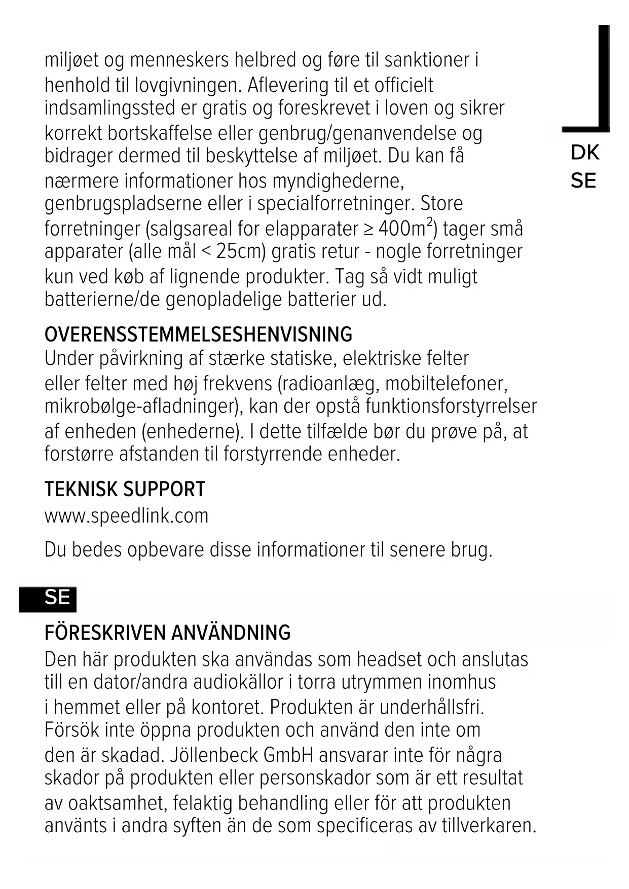 Den här produkten ska användas som headset och anslutas till en dator/andra audiokällor i torra utrymmen inomhus i hemmet eller på kontoret. Produkten är underhållsfri. Försök inte öppna produkten och använd den inte om den är skadad. Jöllenbeck GmbH ansvarar inte för några skador på produkten eller personskador som är ett resultat av oaktsamhet, felaktig behandling eller för att produkten använts i andra syften än de som specificeras av tillverkaren.UNDVIK HÖRSELSKADOR AKTA: När man använder hörlurar eller öronsnäckor och när man lyssnar länge på hög volym finns risk för kroniska hörselskador. Kontrollera alltid volyminställningen innan du sätter på produkten och undvik alltför höga ljudstyrkor. KASSERING Den här symbolen betyder att produkten inte får slängas bland de vanliga hushållssoporna. Gamla apparater eller batterier kan innehålla farliga ämnen som skadar miljön och/ eller människors hälsa. Att förvara eller kassera dem på fel sätt kan leda till påföljder enligt gällande lag. Det kostar ingenting att lämna in dem till ett allmänt insamlingsställe, vilket man också är skyldig till enligt lag. På så sätt garanteras att den här typen av produkter kasseras, återvinns eller återanvänds korrekt och på ett sätt som gynnar miljön. Information finns hos myndigheter, återvinningsanläggningar och specialistföretag. Stora butiker (≥ 400m² säljyta för elektriska apparater) tar emot mindre produkter (alla mått < 25cm) kostnadsfritt, mindre butiker bara när man köper likvärdiga produkter. Ta helst ut batterierna
