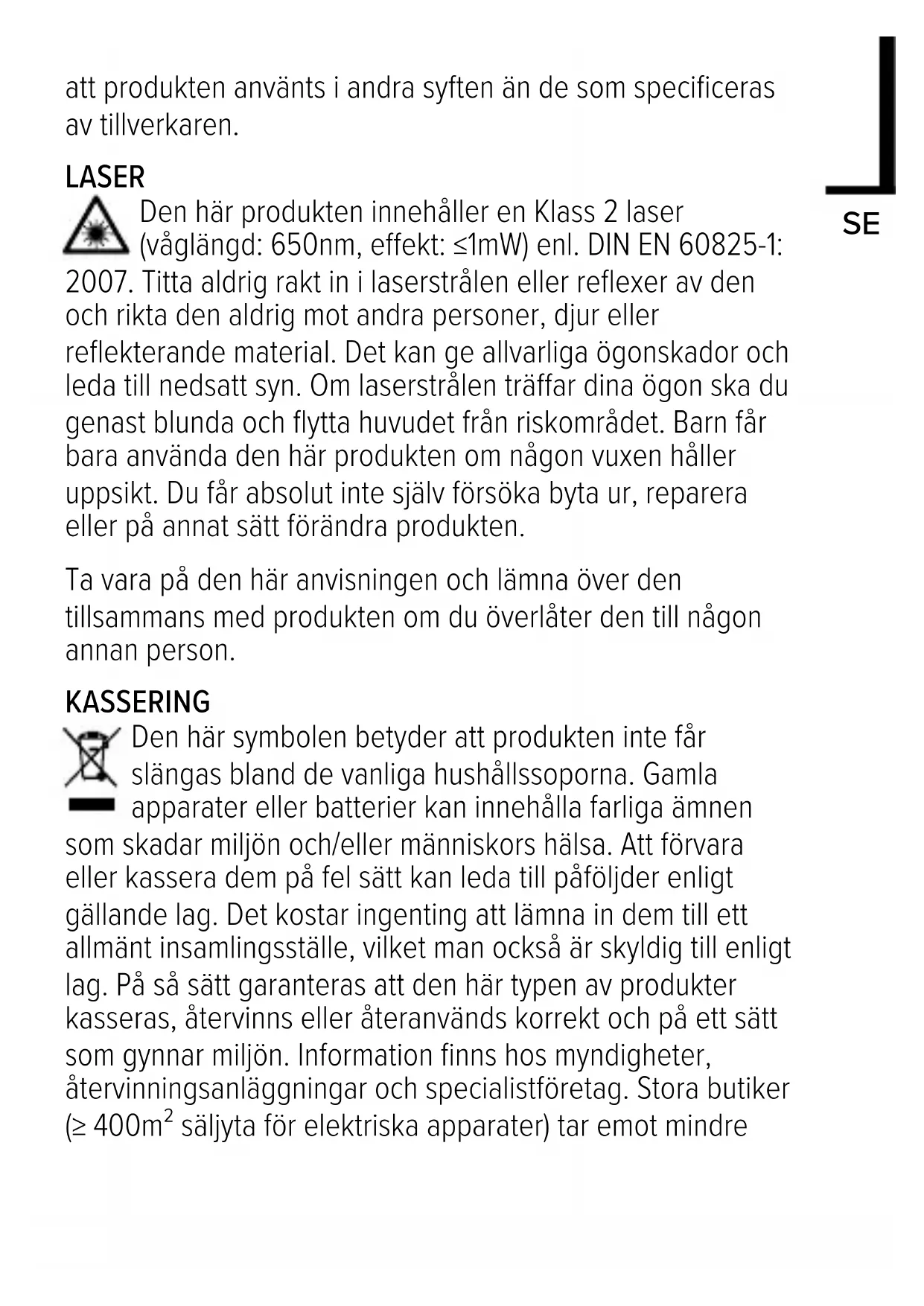 Den här produkten drivs med alkaliska manganceller. Endast den typen av batterier får användas. Byt genast ut gamla/urladdade batterier, ladda inte upp dem igen. Förvara batterier på ett torrt ställe utom räckhåll för barn. Får inte kastas i en eld eller utsättas för höga temperaturer.