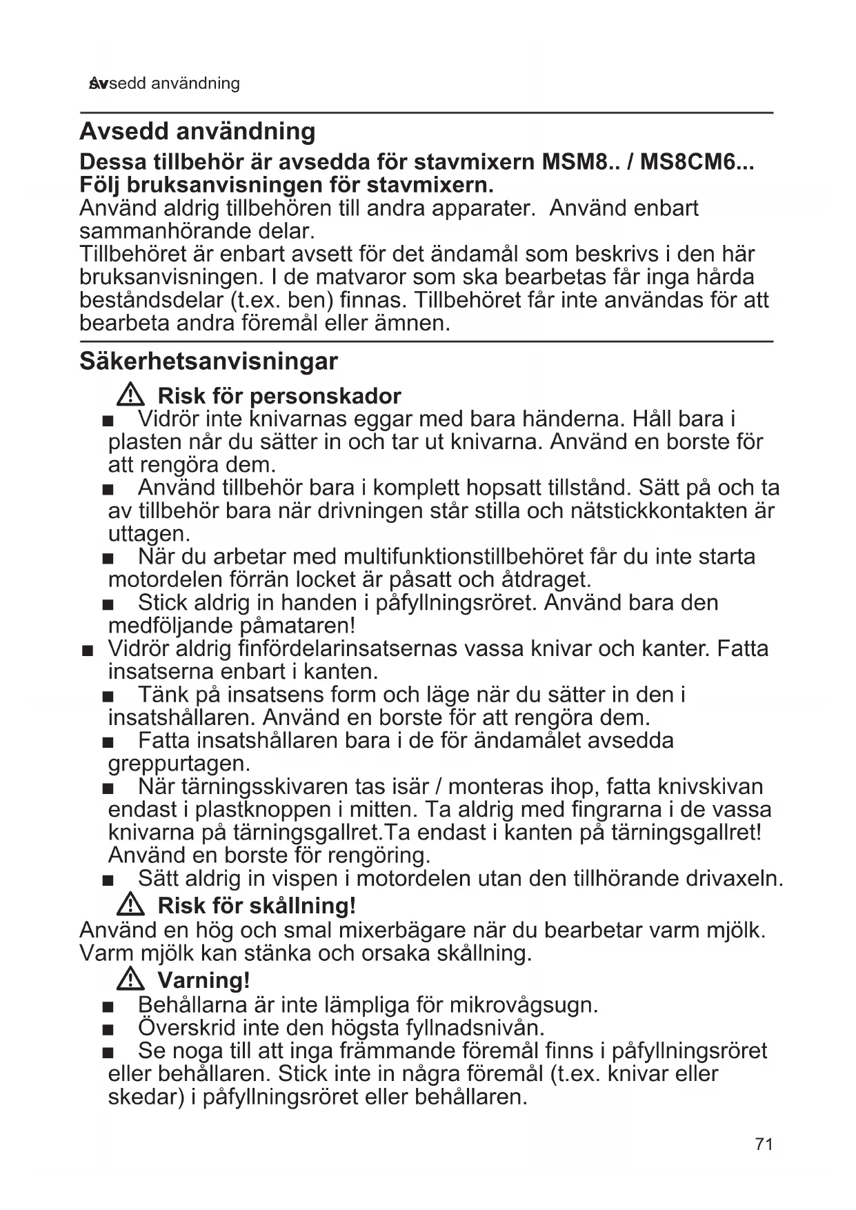 Avsedd användning Avsedd användning Dessa tillbehör är avsedda för stavmixern MSM8.. / MS8CM6... Följ bruksanvisningen för stavmixern. Använd aldrig tillbehören till andra apparater. Använd enbart sammanhörande delar. Tillbehöret är enbart avsett för det ändamål som beskrivs i den här bruksanvisningen. I de matvaror som ska bearbetas får inga hårda beståndsdelar (t.ex. ben) finnas. Tillbehöret får inte användas för att bearbeta andra föremål eller ämnen. Säkerhetsanvisningar W Risk för personskador ■ Vidrör inte knivarnas eggar med bara händerna. Håll bara i plasten når du sätter in och tar ut knivarna. Använd en borste för att rengöra dem. ■ Använd tillbehör bara i komplett hopsatt tillstånd. Sätt på och ta av tillbehör bara när drivningen står stilla och nätstickkontakten är uttagen. ■ När du arbetar med multifunktionstillbehöret får du inte starta motordelen förrän locket är påsatt och åtdraget. ■ Stick aldrig in handen i påfyllningsröret. Använd bara den medföljande påmataren! ■ Vidrör aldrig finfördelarinsatsernas vassa knivar och kanter. Fatta insatserna enbart i kanten. ■ Tänk på insatsens form och läge när du sätter in den i insatshållaren. Använd en borste för att rengöra dem. ■ Fatta insatshållaren bara i de för ändamålet avsedda greppurtagen. ■ När tärningsskivaren tas isär / monteras ihop, fatta knivskivan endast i plastknoppen i mitten. Ta aldrig med fingrarna i de vassa knivarna på tärningsgallret.Ta endast i kanten på tärningsgallret! Använd en borste för rengöring. ■ Sätt aldrig in vispen i motordelen utan den tillhörande drivaxeln. W Risk för skållning! Använd en hög och smal mixerbägare när du bearbetar varm mjölk. Varm mjölk kan stänka och orsaka skållning. W Varning! ■ Behållarna är inte lämpliga för mikrovågsugn. ■ Överskrid inte den högsta fyllnadsnivån. ■ Se noga till att inga främmande föremål finns i påfyllningsröret eller behållaren. Stick inte in några föremål (t.ex. knivar eller skedar) i påfyllningsröret eller behållaren.72 sv Säkerhetsanvisningar ■ Arbeta aldrig med stavmixern (mixerfoten) i behållaren. ■ Följande delar får aldrig doppas i vätskor, hållas under rinnande vatten eller maskindiskas: drivningstillsats, drivaxel, lock med drivning. W Viktigt! Rengör ovillkorligen tillbehöret noggrant efter varje användning och om du inte har använt det under en längre tid. X ”Rengöring och skötsel” se sidan 79 Tärningsskivare k Hållare l Knivskiva m Tärningsgaller, små (ca 9 mm) n Tärningsgaller, stort (ca 13 mm) * o Tärningsgallerrengörare (handtaget vridbart för de olika tärningsgallren) 4 Visp * a Drivaxel