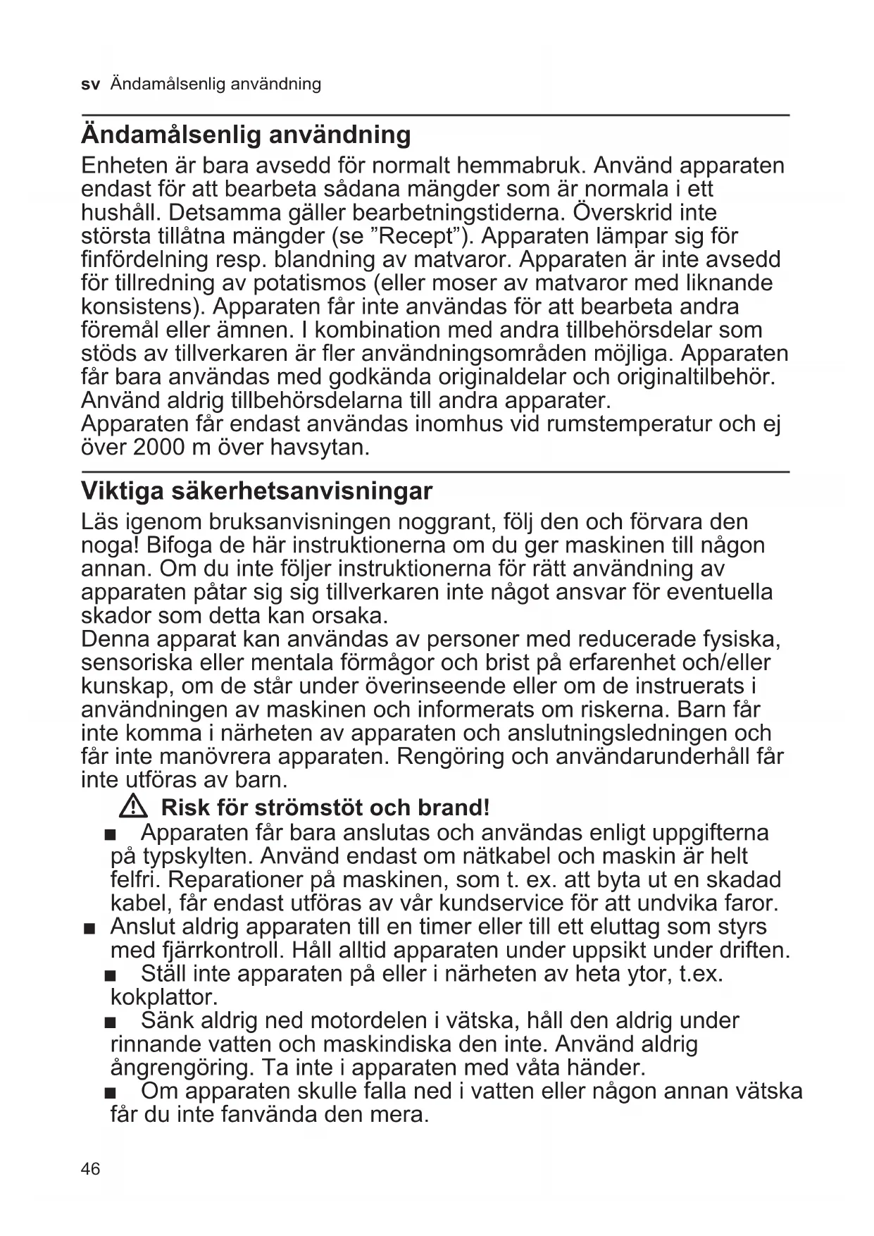 WEEE). Direktivet angir rammene for innlevering og gjenvinning av innbytteprodukter. Faghandelen kan gi opplysninger om aktuelle avfallsmottak. Garanti For dette apparatet gjelder de garantibe- tingelser som er oppgitt av vår representant i de respektive land. Detaljer om disse garantibetingelsene får du ved å henvende deg til elektrohandelen der du har kjøpt apparatet. Ved krav i forbindelse med garantiytelser, er det i alle fall nødvendig å legge fram kvittering for kjøpet av apparatet. Det tas forbehold om endringer.46 sv Ändamålsenlig användning Ändamålsenlig användning Enheten är bara avsedd för normalt hemmabruk. Använd apparaten endast för att bearbeta sådana mängder som är normala i ett hushåll. Detsamma gäller bearbetningstiderna. Överskrid inte största tillåtna mängder (se ”Recept”). Apparaten lämpar sig för finfördelning resp. blandning av matvaror. Apparaten är inte avsedd för tillredning av potatismos (eller moser av matvaror med liknande konsistens). Apparaten får inte användas för att bearbeta andra föremål eller ämnen. I kombination med andra tillbehörsdelar som stöds av tillverkaren är fler användningsområden möjliga. Apparaten får bara användas med godkända originaldelar och originaltilbehör. Använd aldrig tillbehörsdelarna till andra apparater. Apparaten får endast användas inomhus vid rumstemperatur och ej över 2000 m över havsytan. Viktiga säkerhetsanvisningar Läs igenom bruksanvisningen noggrant, följ den och förvara den noga! Bifoga de här instruktionerna om du ger maskinen till någon annan. Om du inte följer instruktionerna för rätt användning av apparaten påtar sig sig tillverkaren inte något ansvar för eventuella skador som detta kan orsaka. Denna apparat kan användas av personer med reducerade fysiska, sensoriska eller mentala förmågor och brist på erfarenhet och/eller kunskap, om de står under överinseende eller om de instruerats i användningen av maskinen och informerats om riskerna. Barn får inte komma i närheten av apparaten och anslutningsledningen och får inte manövrera apparaten. Rengöring och användarunderhåll får inte utföras av barn. W Risk för strömstöt och brand! ■ Apparaten får bara anslutas och användas enligt uppgifterna på typskylten. Använd endast om nätkabel och maskin är helt felfri. Reparationer på maskinen, som t. ex. att byta ut en skadad kabel, får endast utföras av vår kundservice för att undvika faror. ■ Anslut aldrig apparaten till en timer eller till ett eluttag som styrs med fjärrkontroll. Håll alltid apparaten under uppsikt under driften. ■ Ställ inte apparaten på eller i närheten av heta ytor, t.ex. kokplattor. ■ Sänk aldrig ned motordelen i vätska, håll den aldrig under rinnande vatten och maskindiska den inte. Använd aldrig ångrengöring. Ta inte i apparaten med våta händer. ■ Om apparaten skulle falla ned i vatten eller någon annan vätska får du inte fanvända den mera.47