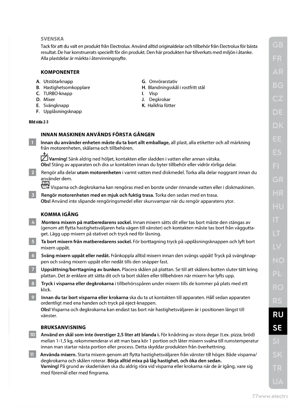 SVENSKA Tack för att du valt en produkt från Electrolux. Använd alltid originaldelar och tillbehör från Electrolux för bästa resultat. De har konstruerats speciellt för din produkt. Den här produkten har tillverkats med miljön i åtanke. Alla plastdelar är märkta i återvinningssyfte. KOMPONENTER A. Utstötarknapp B. Hastighetsomkopplare C. TURBO-knapp D. Mixer E. Svängknapp F. Upplåsningsknapp G. Omrörarstativ H. Blandningsskål i rostfritt stål