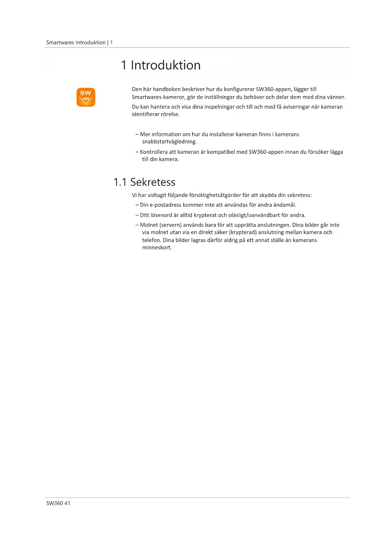 Vi har vidtagit följande försiktighetsåtgärder för att skydda din sekretess: – Din e-postadress kommer inte att användas för andra ändamål. – Ditt lösenord är alltid krypterat och oläsligt/oanvändbart för andra. – Molnet (servern) används bara för att upprätta anslutningen. Dina bilder går inte via molnet utan via en direkt säker (krypterad) anslutning mellan kamera och telefon. Dina bilder lagras därför aldrig på ett annat ställe än kamerans minneskort.2 | Installera appen Smartwares 42 SW360 2 Installera appen Innan du kan börja använda kameran måste du först installera SW360-appen på din smartphone. SW360-appen är tillgänglig för Android- och iOS-enheter (Apple). a) Öppna Apples App Store eller Google Play Butik. b) Sök efter SW360. c) Ladda ned och installera appen. ð Du kan nu börja använda SW360-appen på din smartphone.