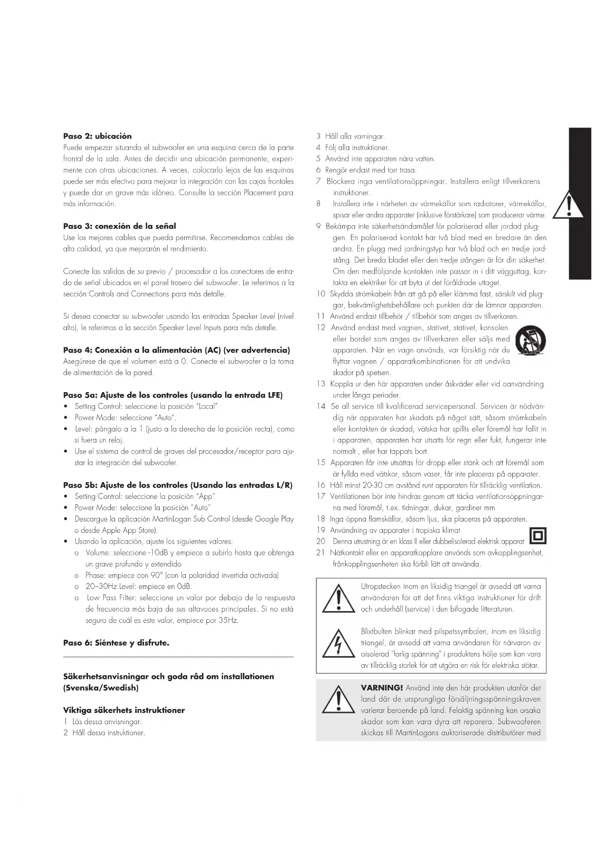 Denna utrustning är en klass II eller dubbelisolerad elektrisk apparat 21 Nätkontakt eller en apparatkopplare används som avkopplingsenhet, frånkopplingsenheten ska förbli lätt att använda. Utropstecken inom en liksidig triangel är avsedd att varna användaren för att det finns viktiga instruktioner för drift och underhåll (service) i den bifogade litteraturen. Blixtbulten blinkar med pilspetssymbolen, inom en liksidig triangel, är avsedd att varna användaren för närvaron av oisolerad "farlig spänning" i produktens hölje som kan vara av tillräcklig storlek för att utgöra en risk för elektriska stötar. VARNING! Använd inte den här produkten utanför det land där de ursprungliga försäljningsspänningskraven varierar beroende på land. Felaktig spänning kan orsaka skador som kan vara dyra att reparera. Subwooferen skickas till MartinLogans auktoriserade distributörer medrätt strömförsörjning för användning i det avsedda landet. En lista över auktoriserade distributörer kan nås på www. martinlogan.com eller via e-post info@martinlogan.com. VARNING!
