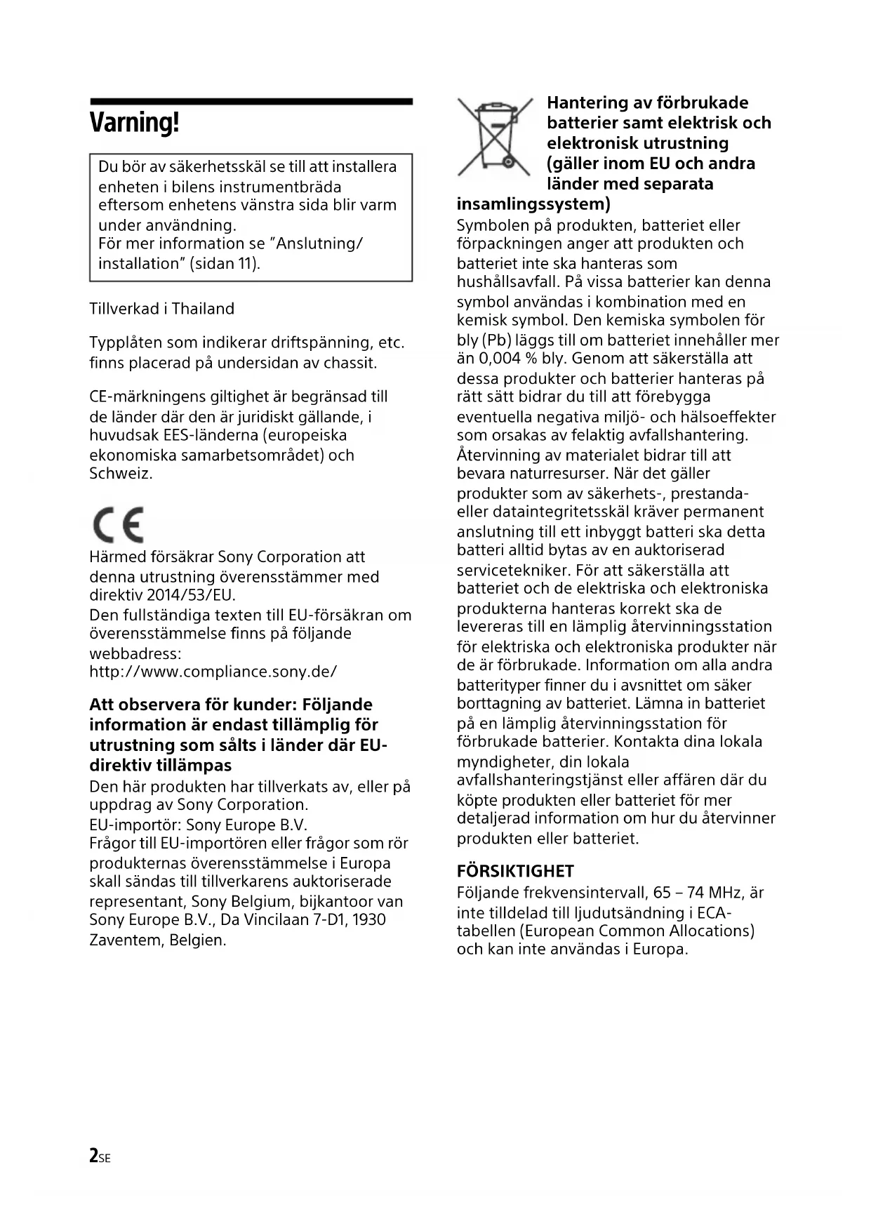 Het voorpaneel verwijderen en vastmaken Het toestel initialiseren De zekering vervangen Zekering (15 A)2SE Varning! Tillverkad i Thailand Typplåten som indikerar driftspänning, etc. finns placerad på undersidan av chassit. CE-märkningens giltighet är begränsad till de länder där den är juridiskt gällande, i huvudsak EES-länderna (europeiska ekonomiska samarbetsområdet) och Schweiz. Härmed försäkrar Sony Corporation att denna utrustning överensstämmer med direktiv 2014/53/EU. Den fullständiga texten till EU-försäkran om överensstämmelse finns på följande webbadress: http://www.compliance.sony.de/ Att observera för kunder: Följande information är endast tillämplig för utrustning som sålts i länder där EU- direktiv tillämpas Den här produkten har tillverkats av, eller på uppdrag av Sony Corporation. EU-importör: Sony Europe B.V. Frågor till EU-importören eller frågor som rör produkternas överensstämmelse i Europa skall sändas till tillverkarens auktoriserade representant, Sony Belgium, bijkantoor van Sony Europe B.V., Da Vincilaan 7-D1, 1930 Zaventem, Belgien. Hantering av förbrukade batterier samt elektrisk och elektronisk utrustning (gäller inom EU och andra länder med separata insamlingssystem) Symbolen på produkten, batteriet eller förpackningen anger att produkten och batteriet inte ska hanteras som hushållsavfall. På vissa batterier kan denna symbol användas i kombination med en kemisk symbol. Den kemiska symbolen för bly (Pb) läggs till om batteriet innehåller mer än 0,004 % bly. Genom att säkerställa att dessa produkter och batterier hanteras på rätt sätt bidrar du till att förebygga eventuella negativa miljö- och hälsoeffekter som orsakas av felaktig avfallshantering. Återvinning av materialet bidrar till att bevara naturresurser. När det gäller produkter som av säkerhets-, prestanda- eller dataintegritetsskäl kräver permanent anslutning till ett inbyggt batteri ska detta batteri alltid bytas av en auktoriserad servicetekniker. För att säkerställa att batteriet och de elektriska och elektroniska produkterna hanteras korrekt ska de levereras till en lämplig återvinningsstation för elektriska och elektroniska produkter när de är förbrukade. Information om alla andra batterityper finner du i avsnittet om säker borttagning av batteriet. Lämna in batteriet på en lämplig återvinningsstation för förbrukade batterier. Kontakta dina lokala myndigheter, din lokala avfallshanteringstjänst eller affären där du köpte produkten eller batteriet för mer detaljerad information om hur du återvinner produkten eller batteriet. FÖRSIKTIGHET Följande frekvensintervall, 65 – 74 MHz, är inte tilldelad till ljudutsändning i ECA- tabellen (European Common Allocations) och kan inte användas i Europa. Du bör av säkerhetsskäl se till att installera enheten i bilens instrumentbräda eftersom enhetens vänstra sida blir varm under användning. För mer information se ”Anslutning/ installation” (sidan 11).3SE Friskrivning gällande tjänster som erbjuds av tredje part Tjänster som erbjuds av tredje part kan komma att ändras, upphävas eller avslutas utan föregående meddelande. Sony har inget ansvar när det gäller dessa situationer. Försiktighet