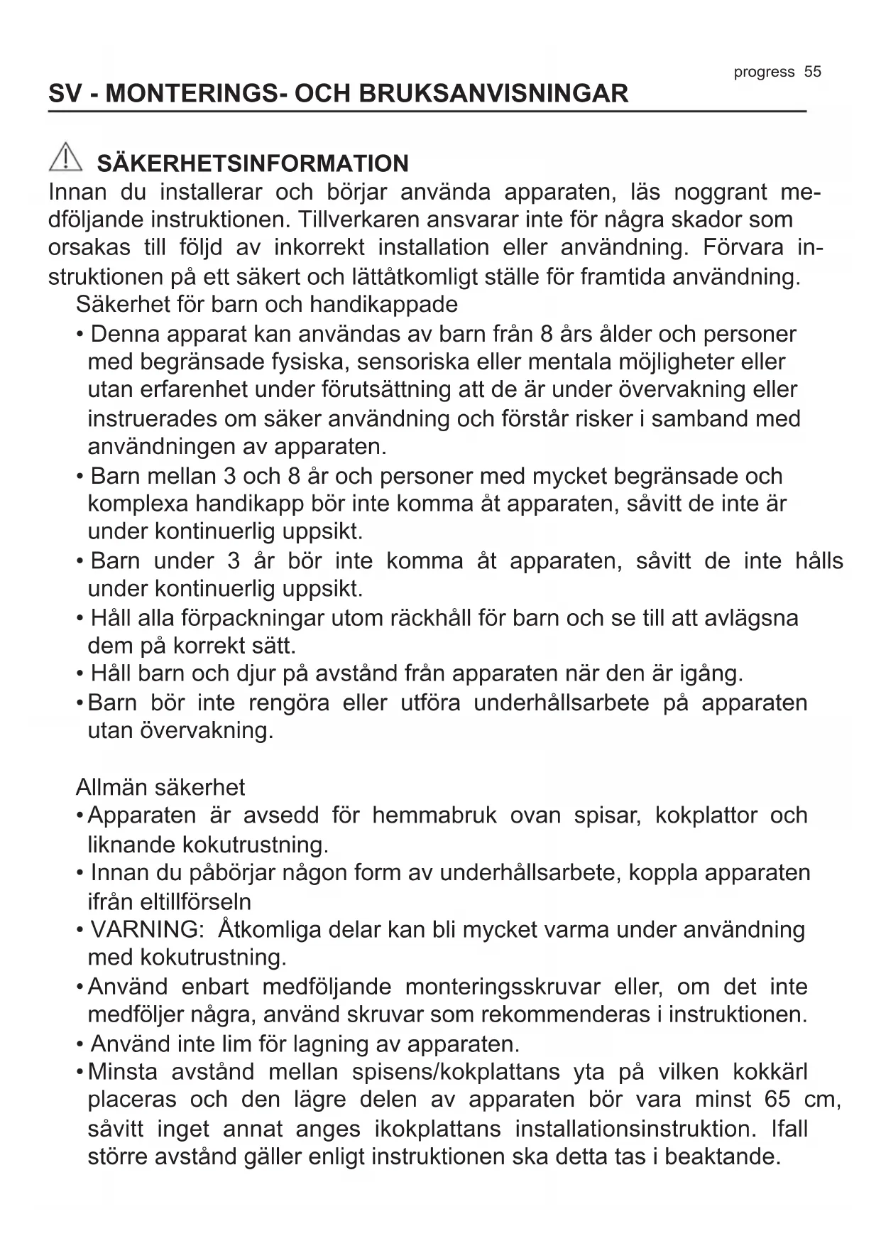 - Minsta avstånd mellan spisens/kokplattans yta på vilken kokkärl placeras och den lägre delen av apparaten bör vara minst 65 cm, såvitt inget annat anges ikokplattans installationsinstruktion. Ifall större avstånd gäller enligt instruktionen ska detta tas i beaktande.56 progress