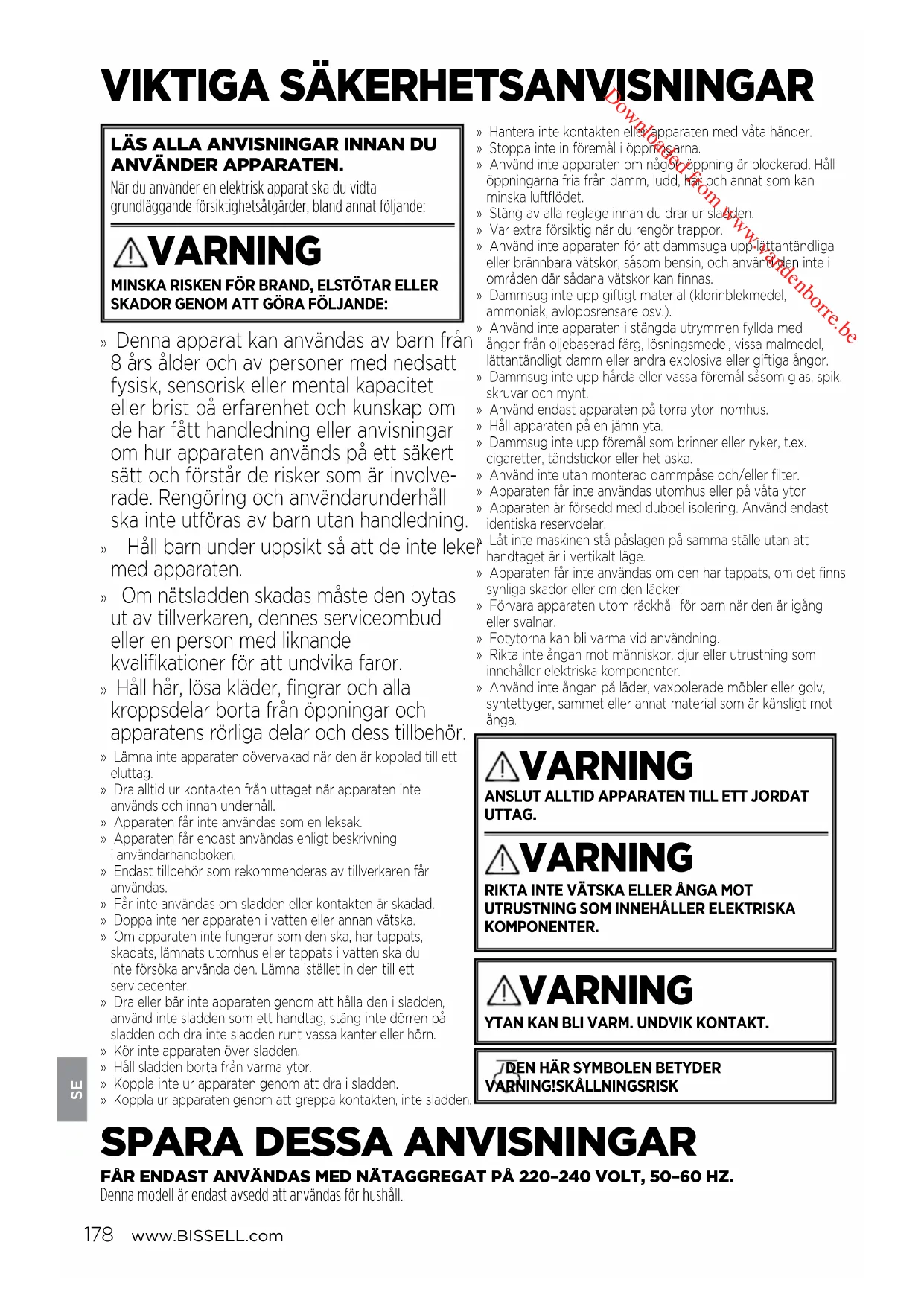FÅR ENDAST ANVÄNDAS MED NÄTAGGREGAT PÅ 220–240VOLT, 50–60HZ. Denna modell är endast avsedd att användas för hushåll. Downloaded from www.vandenborre.bewww.BISSELL.com