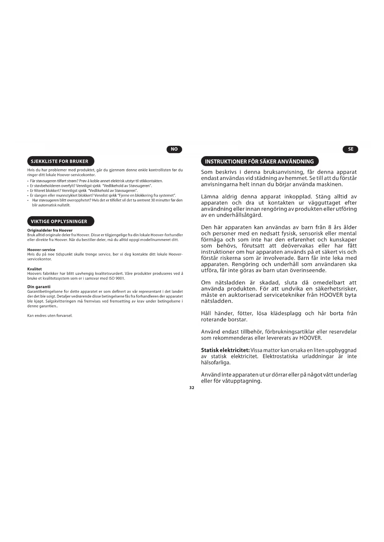 rengjøring av tekstiler og andre områder som er vanskelige å rengjøre. Er spesielt godt egnet til fjerning av dyrehår. [W] Miniturbomunnstykke for allergen* – Bruk miniturbomunnstykket i trapper eller for dyp rengjøring av tekstiler og andre områder som er vanskelige å rengjøre. Er spesielt godt egnet til fjerning av allergener. [X] VIKTIG: Ikke bruk minitUrbomUnnstykkene på tepper med lange frynser, dyreskinn eller på tepper med en tråddybde på mer enn 15 mm. Munnstykket må holdes i stadig bevegelse mens børsten roterer.INSTRUKTIONER FÖR SÄKER ANVÄNDNING Som beskrivs i denna bruksanvisning, får denna apparat endast användas vid städning av hemmet. Se till att du förstår anvisningarna helt innan du börjar använda maskinen. Lämna aldrig denna apparat inkopplad. Stäng alltid av apparaten och dra ut kontakten ur vägguttaget efter användning eller innan rengöring av produkten eller utföring av en underhållsåtgärd. Den här apparaten kan användas av barn från 8 års ålder och personer med en nedsatt fysisk, sensorisk eller mental förmåga och som inte har den erfarenhet och kunskaper som behövs, förutsatt att deövervakas eller har fått instruktioner om hur apparaten används på et säkert vis och förstår riskerna som är involverade. Barn får inte leka med apparaten. Rengöring och underhåll som användaren ska utföra, får inte göras av barn utan överinseende. Om nätsladden är skadad, sluta då omedelbart att använda produkten. För att undvika en säkerhetsrisker, måste en auktoriserad servicetekniker från HOOVER byta nätsladden. Håll händer, fötter, lösa klädesplagg och hår borta från roterande borstar. Använd endast tillbehör, förbrukningsartiklar eller reservdelar som rekommenderas eller levererats av HOOVER. Statisk elektricitet: Vissa mattor kan orsaka en liten uppbyggnad av statisk elektricitet. Elektrostatiska urladdningar är inte hälsofarliga. Använd inte apparaten ut ur dörrar eller på något vått underlag eller för våtupptagning.