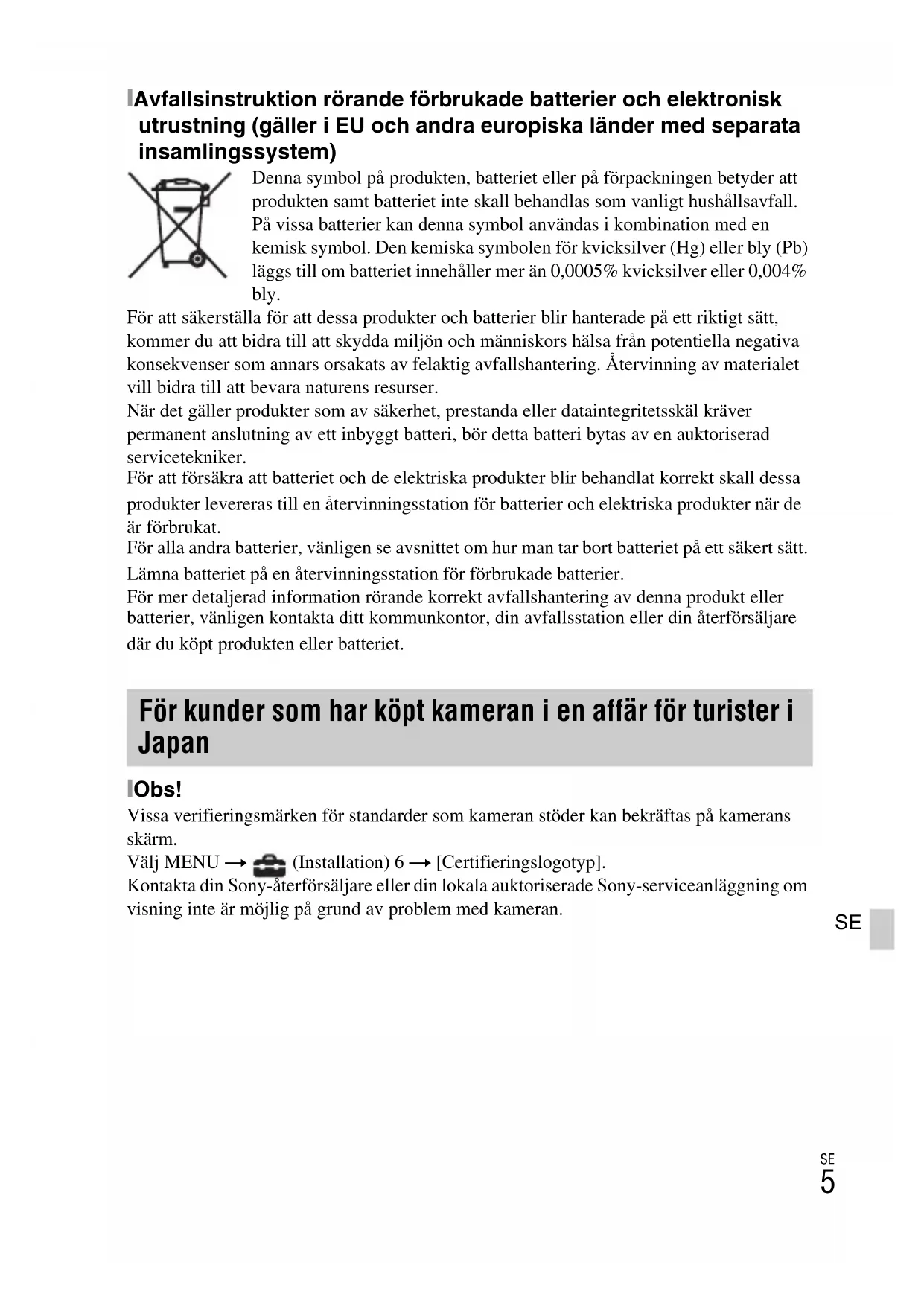 [ Avfallsinstruktion rörande förbrukade batterier och elektronisk utrustning (gäller i EU och andra europiska länder med separata insamlingssystem) Denna symbol på produkten, batteriet eller på förpackningen betyder att produkten samt batteriet inte skall behandlas som vanligt hushållsavfall. På vissa batterier kan denna symbol användas i kombination med en kemisk symbol. Den kemiska symbolen för kvicksilver (Hg) eller bly (Pb) läggs till om batteriet innehåller mer än 0,0005% kvicksilver eller 0,004% bly. För att säkerställa för att dessa produkter och batterier blir hanterade på ett riktigt sätt, kommer du att bidra till att skydda miljön och människors hälsa från potentiella negativa konsekvenser som annars orsakats av felaktig avfallshantering. Återvinning av materialet vill bidra till att bevara naturens resurser. När det gäller produkter som av säkerhet, prestanda eller dataintegritetsskäl kräver permanent anslutning av ett inbyggt batteri, bör detta batteri bytas av en auktoriserad servicetekniker. För att försäkra att batteriet och de elektriska produkter blir behandlat korrekt skall dessa produkter levereras till en återvinningsstation för batterier och elektriska produkter när de är förbrukat. För alla andra batterier, vänligen se avsnittet om hur man tar bort batteriet på ett säkert sätt. Lämna batteriet på en återvinningsstation för förbrukade batterier. För mer detaljerad information rörande korrekt avfallshantering av denna produkt eller batterier, vänligen kontakta ditt kommunkontor, din avfallsstation eller din återförsäljare där du köpt produkten eller batteriet. [ Obs! Vissa verifieringsmärken för standarder som kameran stöder kan bekräftas på kamerans skärm. Välj MENU t (Installation) 6 t [Certifieringslogotyp]. Kontakta din Sony-återförsäljare eller din lokala auktoriserade Sony-serviceanläggning om visning inte är möjlig på grund av problem med kameran. För kunder som har köpt kameran i en affär för turister i JapanSE