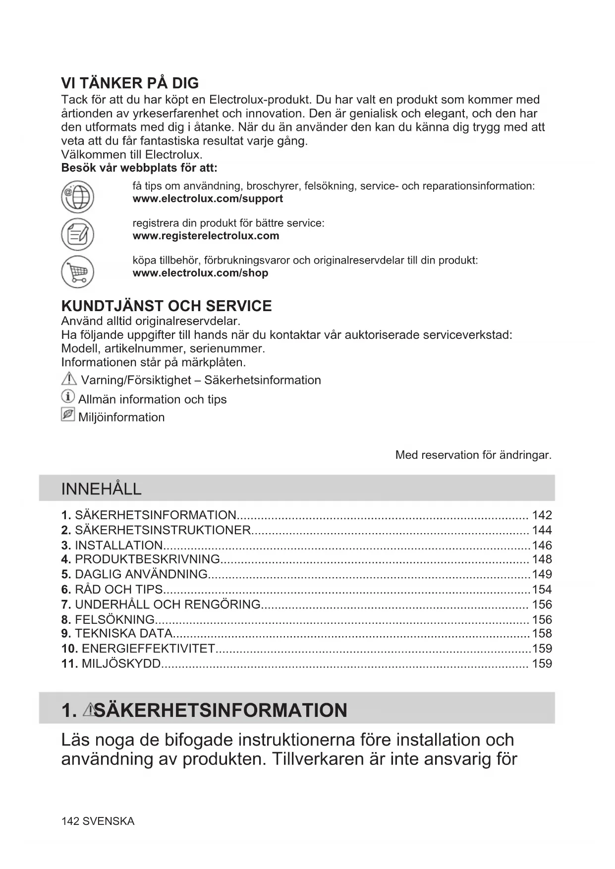 Tack för att du har köpt en Electrolux-produkt. Du har valt en produkt som kommer med årtionden av yrkeserfarenhet och innovation. Den är genialisk och elegant, och den har den utformats med dig i åtanke. När du än använder den kan du känna dig trygg med att veta att du får fantastiska resultat varje gång. Välkommen till Electrolux. Besök vår webbplats för att:få tips om användning, broschyrer, felsökning, service- och reparationsinformation:www.electrolux.com/supportregistrera din produkt för bättre service:www.registerelectrolux.comköpa tillbehör, förbrukningsvaror och originalreservdelar till din produkt:www.electrolux.com/shop