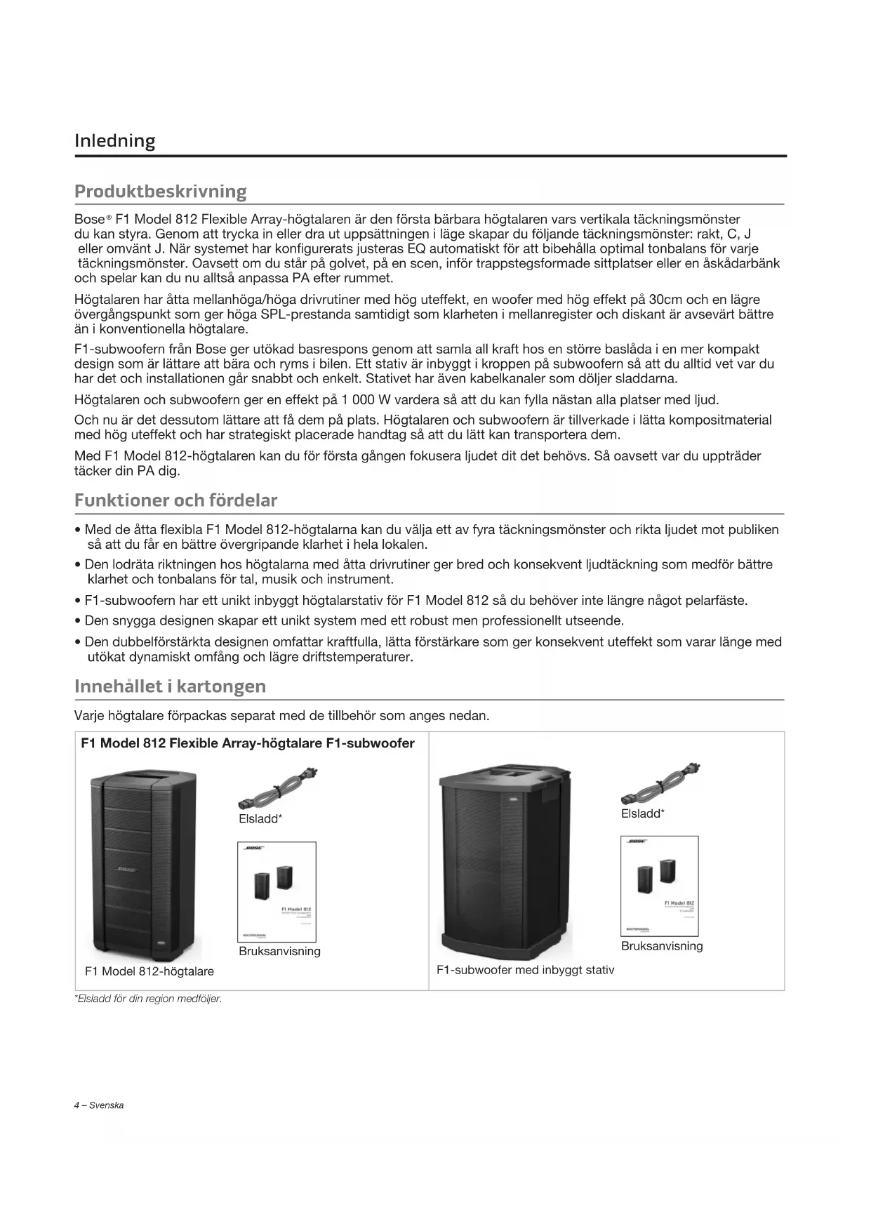 - Den dubbelförstärkta designen omfattar kraftfulla, lätta förstärkare som ger konsekvent uteffekt som varar länge med utökat dynamiskt omfång och lägre driftstemperaturer. Innehållet i kartongen Varje högtalare förpackas separat med de tillbehör som anges nedan. F1 Model 812 Flexible Array-högtalare F1-subwoofer Elsladd* Bruksanvisning F1 Model 812-högtalare Elsladd* Bruksanvisning F1-subwoofer med inbyggt stativ *Elsladd för din region medföljer.Svenska – 5 Inledning F1 Model 812 Flexible Array-högtalare Obs! F1 Model 812 har gängade M8-inpassningar för att rigga och fästa tillbehörsfästen. TÄNK PÅ: Endast yrkeskunniga montörer med kunskap om utrustning och monteringsteknik ska försöka installera högt upphängda högtalare. ÖVERDEL FRAMSIDA BAKSIDA Flexible Array Bärhandtag Bärhandtag Främre LED-lampa Panel för anslutningar och kontroller Gängade M8-inpassningar Gängade M8-inpassningar F1-subwoofer ÖVERDEL FRAMSIDA BAKSIDA Bärhandtag Bärhandtag Främre LED-lampa Panel för anslutningar och kontroller Inbyggt högta- larstativ Elkontakt och strömbrytare Högtalarstati- vets skenor6 – Svenska Inledning Använda Flexible Array Du kan forma täckningsmönstret genom att flytta på den övre och nedre uppsättningen. Uppsättningen hålls på plats av magneter som utlöser interna sensorer som justerar EQ efter uppsättningens form. Justera uppsättningen Trycka in uppsättningen Dra ut uppsättningen Fyra täckningsmönster Rakt mönster Dra ut övre och nedre uppsättning J-mönster Dra ut övre uppsättning, tryck in nedre uppsättning. Omvänt J-mönster Tryck in övre uppsättning, dra ut nedre uppsättning. C-mönster Tryck in övre och nedre uppsättning.Svenska – 7 Inledning Tillämpningar Rakt mönster Använd det raka mönstret när publiken står och deras huvuden är i ungefär samma höjd som högtalaren. Omvänt J-mönster Det omvända-J mönstret passar en publik i trappstegsformade sittplatser som börjar i höjd med högtalaren och sträcker sig ovanför den. J-mönster J-mönstret fungerar bra när högtalaren är på en upphöjd scen och publiken sitter nedanför på golvet. C-mönster Använd C-mönstret för rakade sittplatser i ett auditorium när den första raden är på golvet med högtalaren8 – Svenska Installera systemet Använda F1 Model 812 med F1-subwoofer Det inbyggda högtalarstativet finns på baksidan av subwoofern. Det är enkelt att ställa in F1 Model 812-högtalaren med F1-subwoofern: