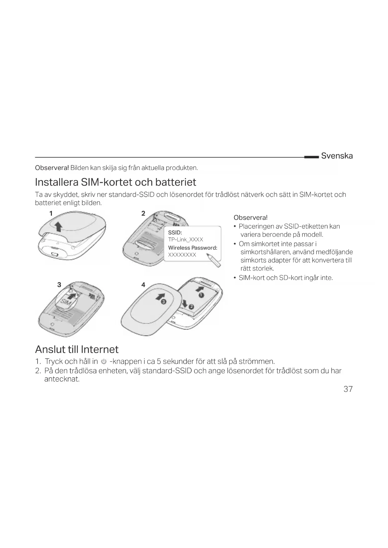 Wireless Password: XXXXXXXX SSID:TP-Link_XXXX SSID: TP-Link_XXXX Wireless Password: XXXXXXXX Observera!• Placeringen av SSID-etiketten kan variera beroende på modell.• Om simkortet inte passar i simkortshållaren, använd medföljande simkorts adapter för att konvertera till rätt storlek.• SIM-kort och SD-kort ingår inte.38 Svenska Obs! Av säkerhetsskäl rekommenderar vi att du ändrar standardinsättlningarna för namn och lösenord för det trådlösa nätverket. Njut! Obs!