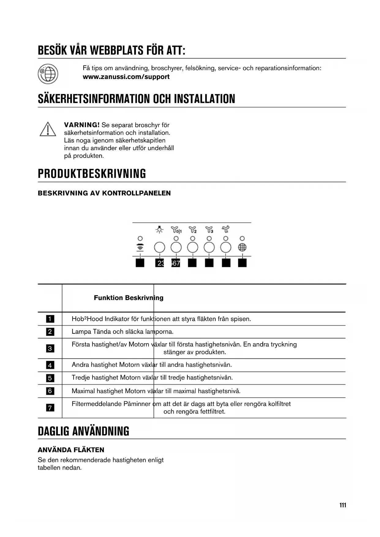 Se den rekommenderade hastigheten enligt tabellen nedan. 111Under uppvärmning av mat, vid tillagning under lock. Vid tillagning under lock på flera kokzoner eller brännare, mild stekning. Under kokning, stekning av stora mängder mat utan lock, tillagning på flera kokzoner eller brännare. Under kokning, stekning av stora mängder mat utan lock, mycket fukt. Fläkten körs på maximal hastighet. Efter 6 mi- nuter återgår produkten till föregående inställning. Vi rekommenderar att du lämnar fläkten på i cirka 15 minuter efter tillagningen. Använda fläkten: