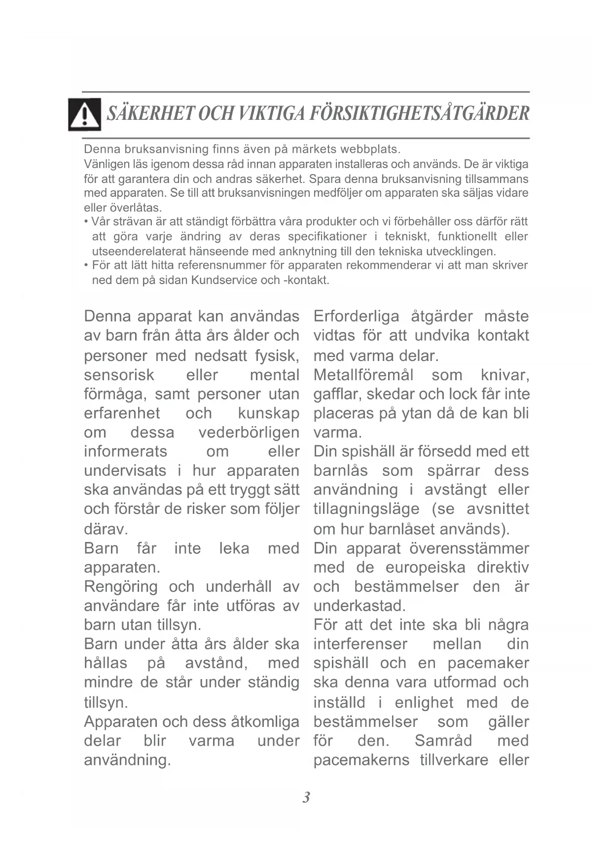 - För att lätt hitta referensnummer för apparaten rekommenderar vi att man skriver ned dem på sidan Kundservice och -kontakt. Denna apparat kan användas av barn från åtta års ålder och personer med nedsatt fysisk, sensorisk eller mental förmåga, samt personer utan erfarenhet och kunskap om dessa vederbörligen informerats om eller undervisats i hur apparaten ska användas på ett tryggt sätt och förstår de risker som följer därav. Barn får inte leka med apparaten. Rengöring och underhåll av användare får inte utföras av barn utan tillsyn. Barn under åtta års ålder ska hållas på avstånd, med mindre de står under ständig tillsyn. Apparaten och dess åtkomliga delar blir varma under användning. Erforderliga åtgärder måste vidtas för att undvika kontakt med varma delar. Metallföremål som knivar, gafflar, skedar och lock får inte placeras på ytan då de kan bli varma. Din spishäll är försedd med ett barnlås som spärrar dess användning i avstängt eller tillagningsläge (se avsnittet om hur barnlåset används). Din apparat överensstämmer med de europeiska direktiv och bestämmelser den är underkastad. För att det inte ska bli några interferenser mellan din spishäll och en pacemaker ska denna vara utformad och inställd i enlighet med de bestämmelser som gäller för den. Samråd med pacemakerns tillverkare eller4 din läkare. Tillagning med fett eller olja på en spishäll utan övervakning kan vara farligt och orsaka eldsvåda. Försök ALDRIG släcka en brand med vatten utan bryt apparatens strömförsörjning och täck lågan med t.ex. ett lock eller en brandfilt. VIKTIGT: tillagning ska ske under tillsyn. Korta tillagningar kräver ständig tillsyn. Brandfara: förvara inte föremål på kokzonerna. Bryt apparatens ström- försörjning om ytan är sprucken för att undvika risk för elstöt. Använd inte spishällen igen förrän glasytan bytts ut. Undvik att stöta kokkärlen mot ytan: glaskeramikytan är mycket tålig men kan ändå gå sönder. Lägg inte varma lock platt på spishällen. Sugkoppseffekten kan skada glaskeramikytan. Undvik att dra kokkärl över ytan. Med tiden kan detta skada den glaskeramiska ytans dekor. Använd aldrig aluminiumfolie för att tillaga mat. Lägg aldrig produkter inslagna i aluminium eller aluminium- förpackningar på din spishäll. Aluminiumet skulle smälta och definitivt fördärva din spishäll. Förvara inte underhålls- eller brandfarliga produkter i möbeln under spishällen. För att undvika fara ska nätsladden om den är skadad bytas av tillverkaren, dennes serviceavdelning eller av någon med motsvarande behörighet. Försäkra dig om att matningssladdar till elektriska apparater som är anslutna i närheten av spishällen inte kommer i kontakt med kokzonerna. Använd aldrig ångtvättapparat för att göra ren spishällen. Apparaten är inte avsedd att slås på via en extern timer eller en separat fjärrkontroll. SÄKERHET OCH VIKTIGA FÖRSIKTIGHETSÅTGÄRDER5 Stäng efter användning av spishällens funktion med hjälp av dess reglage och lita inte på kastrullavkännaren. VARNING: använd endast skydd för spishällar som konstruerats av spishällens tillverkare och som hänvisas till i bruksanvisningen då de är lämpliga för eller inbyggda i apparaten. Används olämpliga skydd kan det medföra olyckshändelse. SÄKERHET OCH VIKTIGA FÖRSIKTIGHETSÅTGÄRDER6