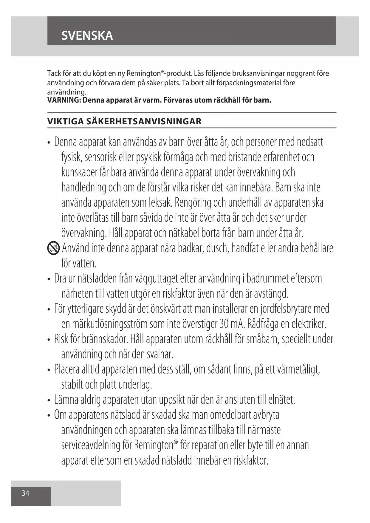 AE34 Tack för att du köpt en ny Remington®-produkt. Läs följande bruksanvisningar noggrant före användning och förvara dem på säker plats. Ta bort allt förpackningsmaterial före användning. VARNING: Denna apparat är varm. Förvaras utom räckhåll för barn.