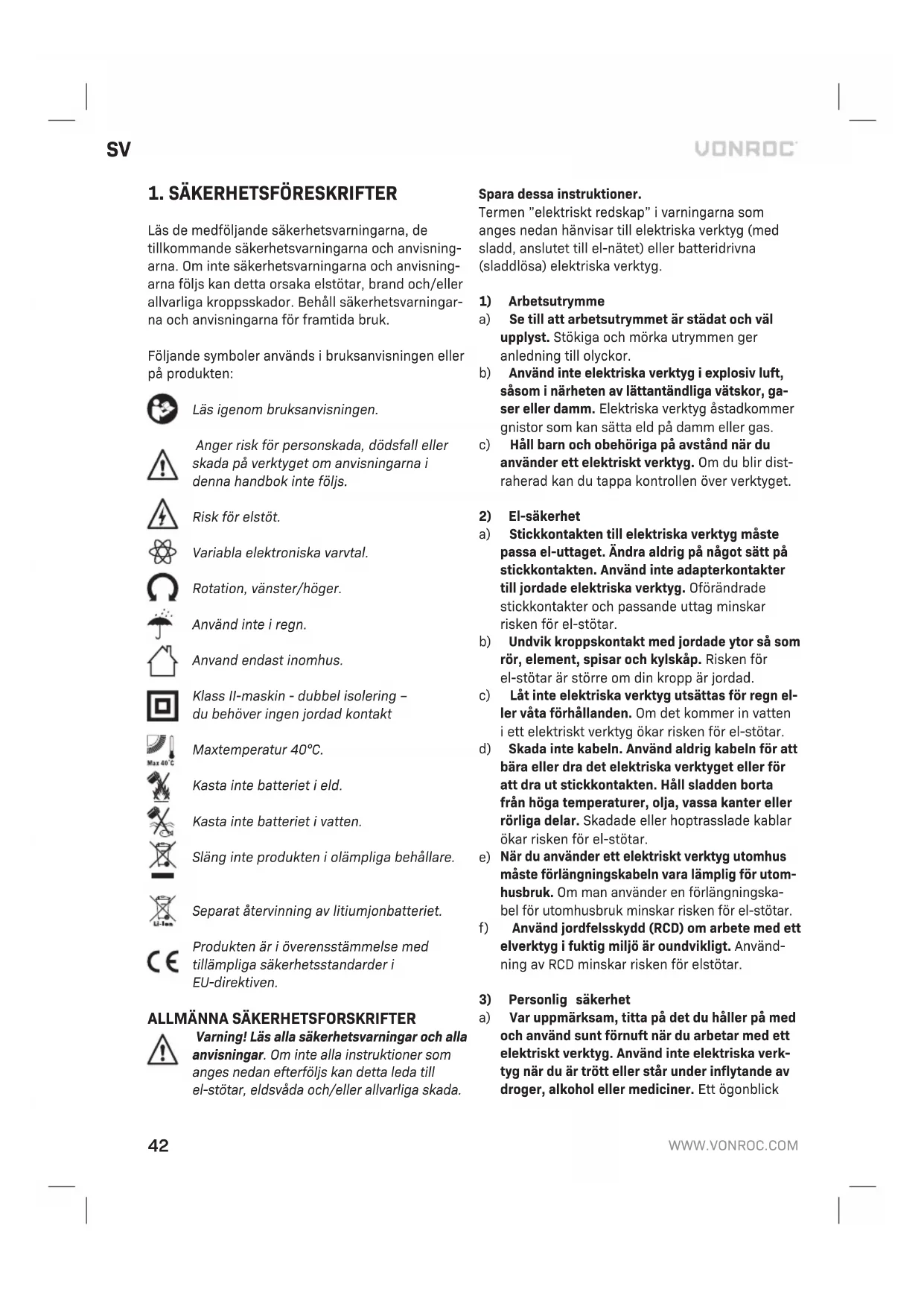- Icke-originalreservdelar har anvants. Detta utgor hela garantin fran foretaget, antingen uttryckt eller underforstatt. Det fi nns inga andra garantier, uttalade eller underforstadda som galler utover ordalydelsen harav, hari, inklusive de out- talade garantierna for saljbarhet och lamplighet for ett sarskilt syfte. Under inga omstandigheter skall VONROC hallas ansvarig for nagra oforutsedda eller indirekta skador. Aterforsaljarens atgarder skall begransas till reparation eller byte av felaktiga enheter eller delar. Med forbehall for andringar i produkten och bruksanvisningen. Specifi kationer kan andras utan forvarning.48