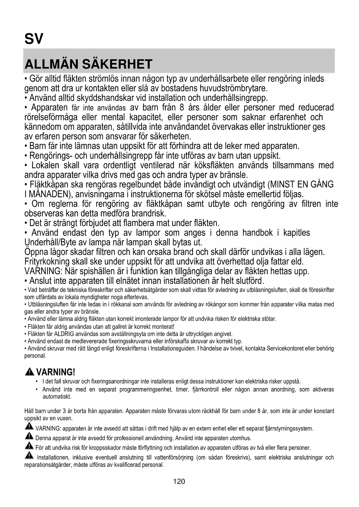 - Lokalen skall vara ordentligt ventilerad när köksfläkten används tillsammans med andra apparater vilka drivs med gas och andra typer av bränsle.