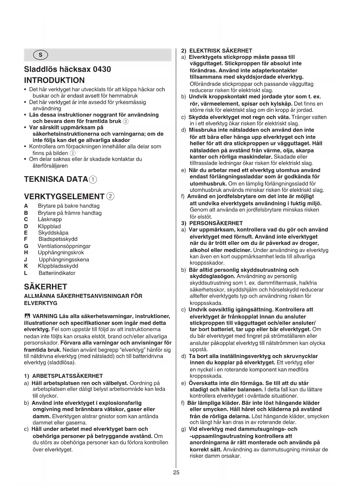 A Brytare på bakre handtag B Brytare på främre handtag C Låsknapp D Klippblad E Skyddskåpa F Bladspetsskydd G Ventilationsöppningar H Upphängningskrok J Upphängningsskena K Klippbladsskydd L Batteriindikator SÄKERHET
