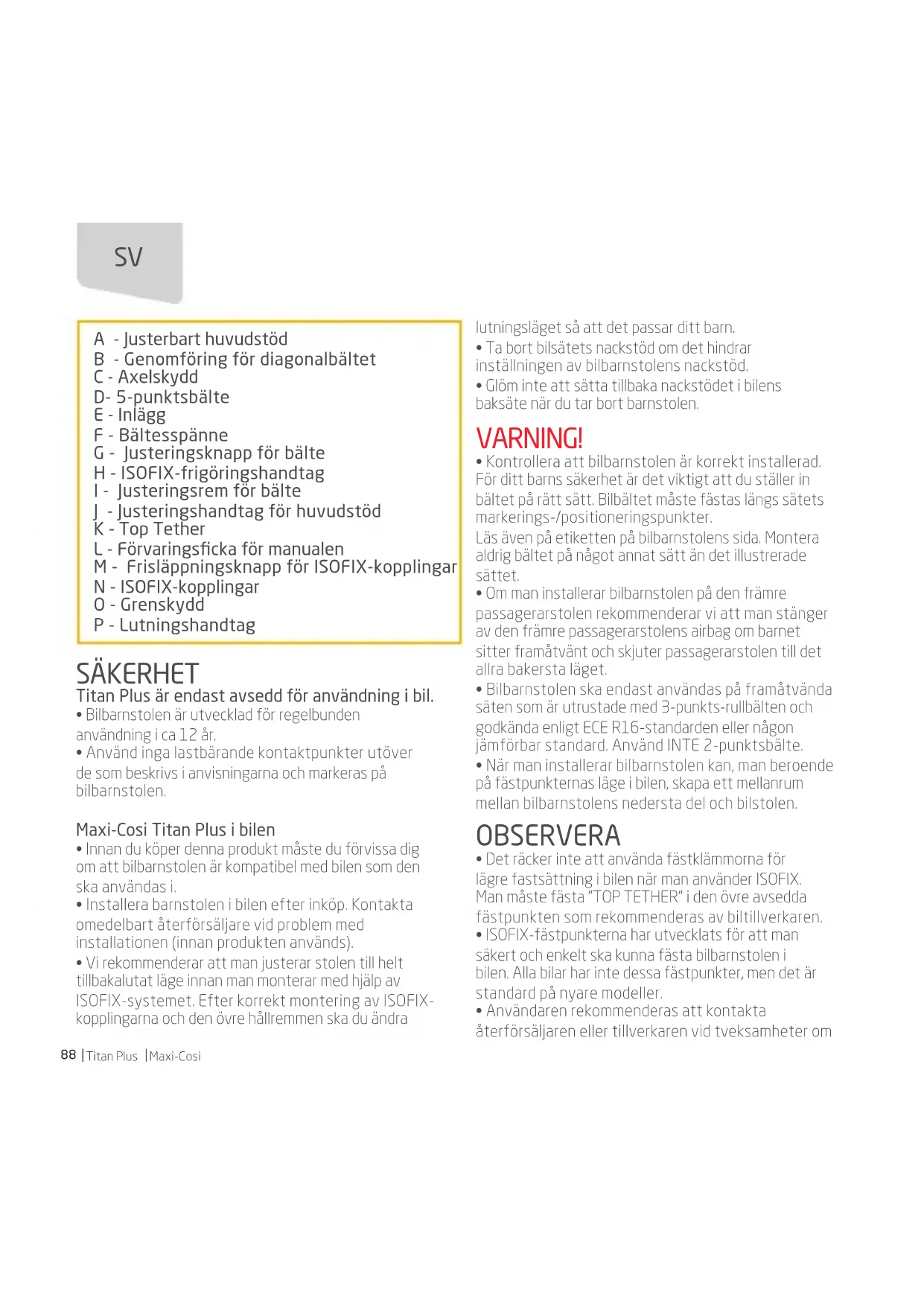 - Användaren rekommenderas att kontakta återförsäljaren eller tillverkaren vid tveksamheter om A - Justerbart huvudstöd B - Genomföring för diagonalbältet C - Axelskydd D- 5-punktsbälte E - Inlägg F - Bältesspänne G - Justeringsknapp för bälte H - ISOFIX-frigöringshandtag I - Justeringsrem för bälte J - Justeringshandtag för huvudstöd K - Top Tether L - Förvaringsficka för manualen M - Frisläppningsknapp för ISOFIX-kopplingar N - ISOFIX-kopplingar O - Grenskydd P - Lutningshandtag SVMaxi-Cosi