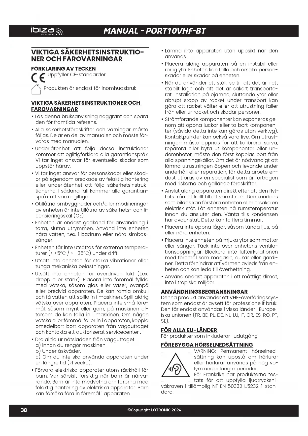 Denna produkt använder ett VHF-överföringssys- tem som endast är avsett för professionellt bruk. Den får endast användas i vissa länder i Europe- iska unionen (FR, BE, PL, DE, NL, LU, IT, GR, ES, RO, PT, SE).