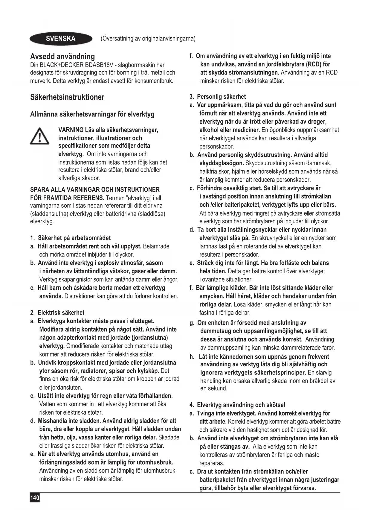 a. Tvinga inte elverktyget. Använd korrekt elverktyg för ditt arbete. Korrekt elverktyg kommer att göra arbetet bättre och säkrare vid den hastighet som det är designad för. b. Använd inte elverktyget om strömbrytaren inte kan slå på eller stängas av. Alla elverktyg som inte kan kontrolleras av strömbrytaren är farliga och måste repareras. c. Dra ut kontakten från strömkällan och/eller batteripaketet från elverktyget innan några justeringar görs, tillbehör byts eller elverktyget förvaras. (Översättning av originalanvisningarna) SVENSKA141 Sådan preventiva säkerhetsåtgärder minskar risken att elverktyget startar oavsiktligt. d. Förvara overksamma elektriska verktyg utom räckhåll för barn och låt inte personer som är obekanta med elverktyget eller dessa instruktioner verktyget. Elverktyg kan vara farliga i händerna på outbildade användare. e. Underhålla elverktyg. Kontrollera om där finns felinriktningar eller rörliga delar som fastnat, trasiga delar eller andra förhållanden som kan påverka elverktygets drift. Vid skador reparera elverktyget innan användning. Många olyckor orsakas av dåligt underhållna elverktyg. f. Hål kapverktyg vassa och rena. Korrekt underhållna kapverktyg med vassa kapkanter är mindre troliga att kärva och lättare att kontrollera. g. Använd elverktyget, tillbehör och verktygsbits etc. i enlighet med dessa instruktion och tänk på arbetsförhållandena och arbetet som skall utföras. Elverktyg som används för arbeten andra än de som är avsedda kan resultera i farliga situationer. h. Håll handtagen och greppytorna torra, rena och fria från olja och fett. Hala handtag och gripande ytor tillåter inte säker hantering och kontroll av verktyget i oväntade situationer.