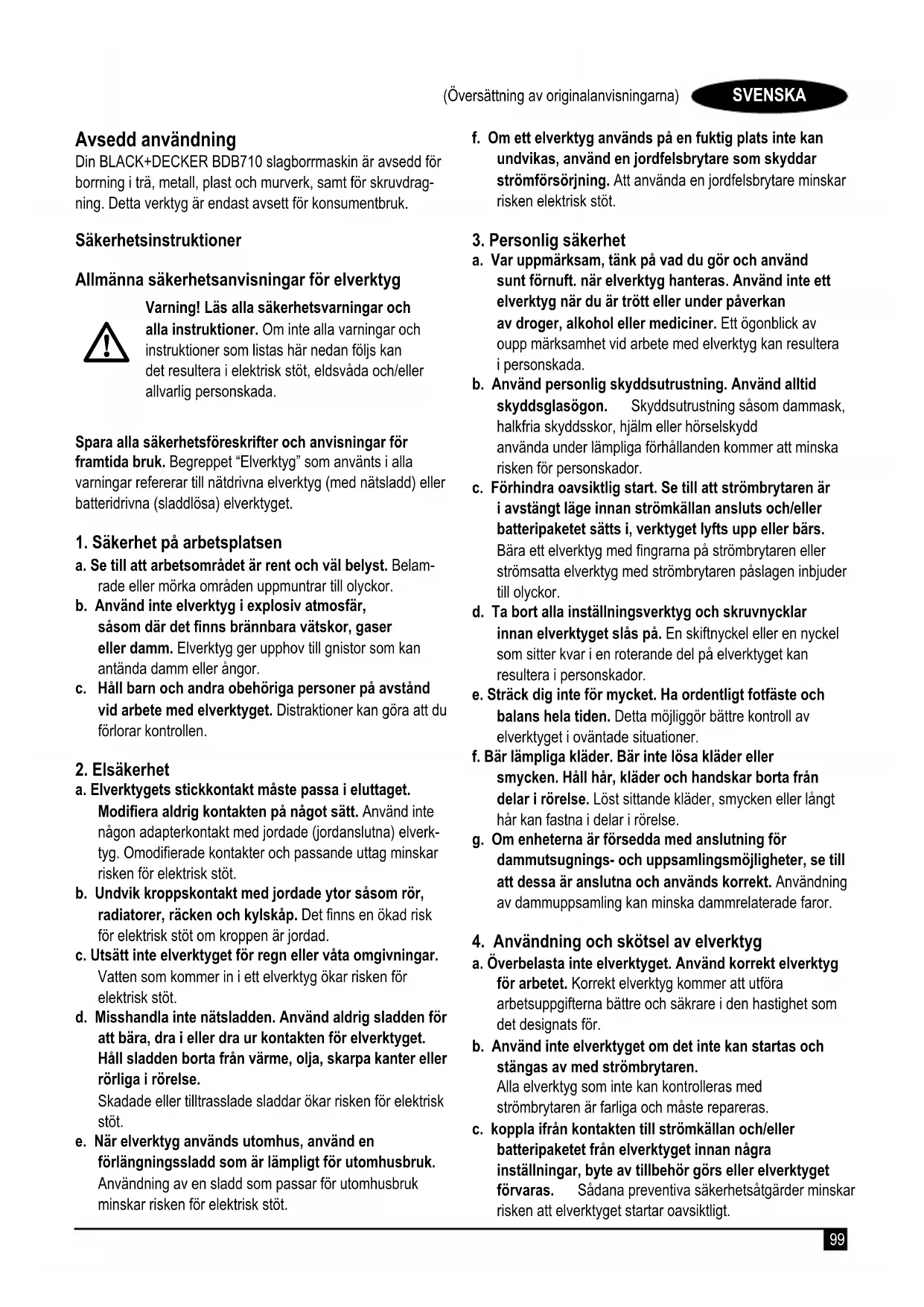 positionen. Ange borrdjup (g. G) u Lossa på sidohandtaget (7) genom att vrida vredet moturs.u Ställ djupstoppet (6) i önskat läge. Det maximala borrd- jupet är lika med avståndet mellan borrens spets och djupstoppets främre ände. u Dra åt sidohandtaget genom att vrida vredet medurs.102 (Översättning av originalanvisningarna) SVENSKA Slå på och av u Slå på verktyget genom att trycka in strömbrytaren för variabel hastighet (1). Verktygets hastighet beror på hur hårt du trycker på strömbrytaren. En allmän regel är att du använder låga hastigheter för borrar med stor diameter och höga hastigheter för borrar med mindre diameter. u Tryck in låsknappen (2) och släpp strömbrytaren för variabel hastighet om du vill ha kontinuerlig drift. Det här alternativet är bara tillgängligt vid full hastighet i både framåtgående och bakåtgående läge. u Slå av verktyget genom att släppa strömbrytaren för variabel hastighet. Under kontinuerlig drift stänger du av verktyget genom att trycka in och släppa strömbrytaren för variabel hastighet en gång till. Tillbehör Verktygets prestanda beror på vilka tillbehör du använder. Tillbehör från BLACK+DECKER håller hög kvalitet och är kon- struerade för att fungera optimalt med verktyget. Genom att använda dessa tillbehör får du ut mesta möjliga av verktyget. Underhåll Din kabelanslutna/sladdlösa BLACK+DECKER-apparat/ verktyg är konstruerad för att fungera en lång tid med minsta möjliga underhåll. Kontinuerlig tillfredsställande drift beror på ordentlig verktygsvård och regelbunden rengöring. Varning! Innan underhåll utförs på verktygett/ sladdlösa elverktyg: u Stäng av apparaten/verktyget och dra ur nätkontakten. u Eller stäng av och ta bort batteriet från apparaten/ verktyget om apparaten/verktyget har separat batteripa- ket. u Eller töm batteriet helt om det är inbyggt och stäng sedan av. u Dra ur sladden till laddaren innan du rengör den. Laddaren kräver inget underhåll förutom regelbunden rengöring. u Rengör regelbundet ventilationsöppningarna på appa- raten/verktyget/laddaren med en mjuk borste eller en torr trasa. u Rengör motorhöljet regelbundet med en fuktig trasa. Använd aldrig något slipande eller lösningsmedelsbaserat rengöringsmedel. u Öppna regelbundet chucken och knacka på den för att ta bort damm från insidan (när den är monterad). Byte av elkontakten (endast Storbritannien och Irland) Om en ny elkontakt måste monteras: u Gör dig av med den gamla kontakten på lämpligt sätt. u Anslut den bruna ledningen till den strömförande anslut- ningen i den nya kontakten. u Anslut den blå ledningen till den icke strömförande anslut- ningen. Varning! Ingenting bör kopplas till jordanslutningen. Följ de monteringsanvisningar som följer med kontakter av god kvalitet. Rekommenderad säkring: 5 A. Skydda miljön Separat insamling. Produkter och batterier som är markerade med denna symbol får inte kastas i de vanliga hushållssoporna. Produkter och batterier innehåller material som kan återanvändas eller återvinnas för att minska behovet av råmaterial. Återvinn elektriska produkter och batterier enligt lokala bestämmelser. Närmare information nns tillgänglig på www.2helpU.com Tekniska data BDB710 Spänning V