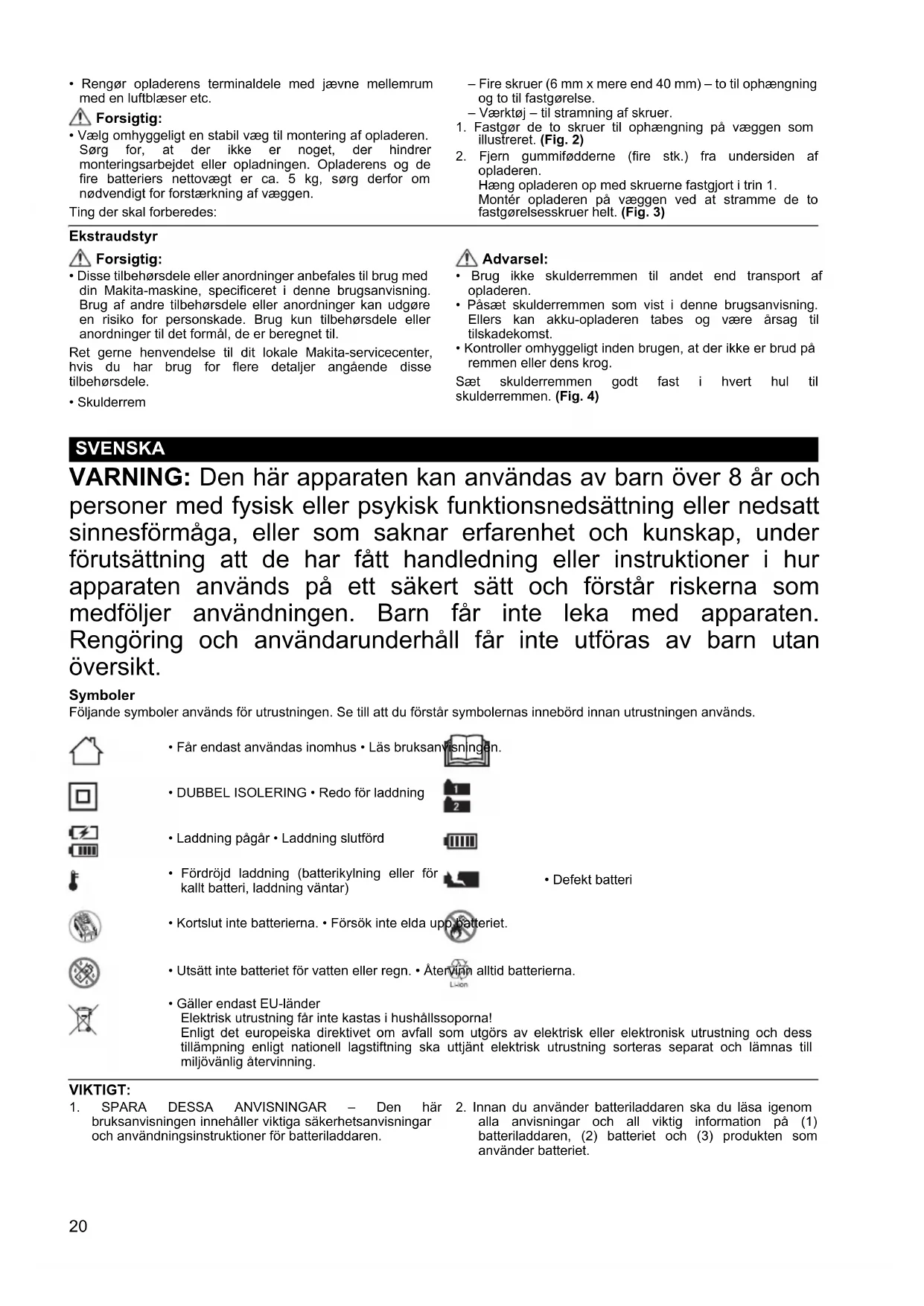 - Kontroller omhyggeligt inden brugen, at der ikke er brud på remmen eller dens krog. Sæt skulderremmen godt fast i hvert hul til skulderremmen. (Fig. 4) VARNING: Den här apparaten kan användas av barn över 8 år och personer med fysisk eller psykisk funktionsnedsättning eller nedsatt sinnesförmåga, eller som saknar erfarenhet och kunskap, under förutsättning att de har fått handledning eller instruktioner i hur apparaten används på ett säkert sätt och förstår riskerna som medföljer användningen. Barn får inte leka med apparaten. Rengöring och användarunderhåll får inte utföras av barn utan översikt. Symboler Följande symboler används för utrustningen. Se till att du förstår symbolernas innebörd innan utrustningen används. VIKTIGT:
