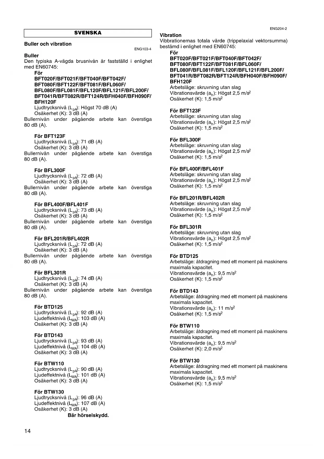 - Vidta skyddsåtgärder för användaren baserat på en bedömning av exponering under aktuella förhållanden (med hänsyn tagen till hela arbetet såsom hur många gånger maskinen stängs av och hur stor del av tiden som den körs obelastad). Støy og vibrasjon ENG103-4 Støy Typisk A-vektet lydtrykknivå bestemt i samsvar med EN60745: For BFT020F/BFT021F/BFT040F/BFT042F/ BFT080F/BFT122F/BFT081F/BFL060F/ BFL080F/BFL081F/BFL120F/BFL121F/BFL200F/ BFT041R/BFT082R/BFT124R/BFH040F/BFH090F/ BFH120F Lydtrykknivå (L