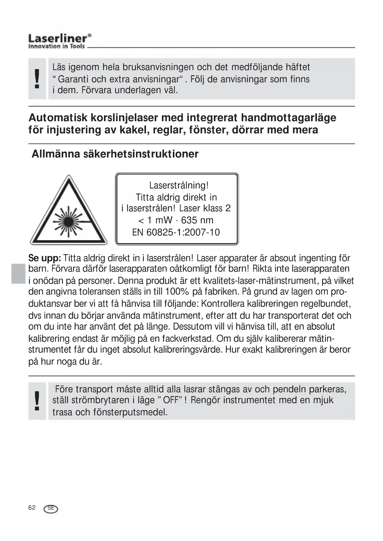 Manual_SmartLineLaser360_Rev.0413.indd 61 13.05.13 09:1862 Läs igenom hela bruksanvisningen och det medföljande häftet “Garanti och extra anvisningar“. Följ de anvisningar som finns i dem. Förvara underlagen väl.