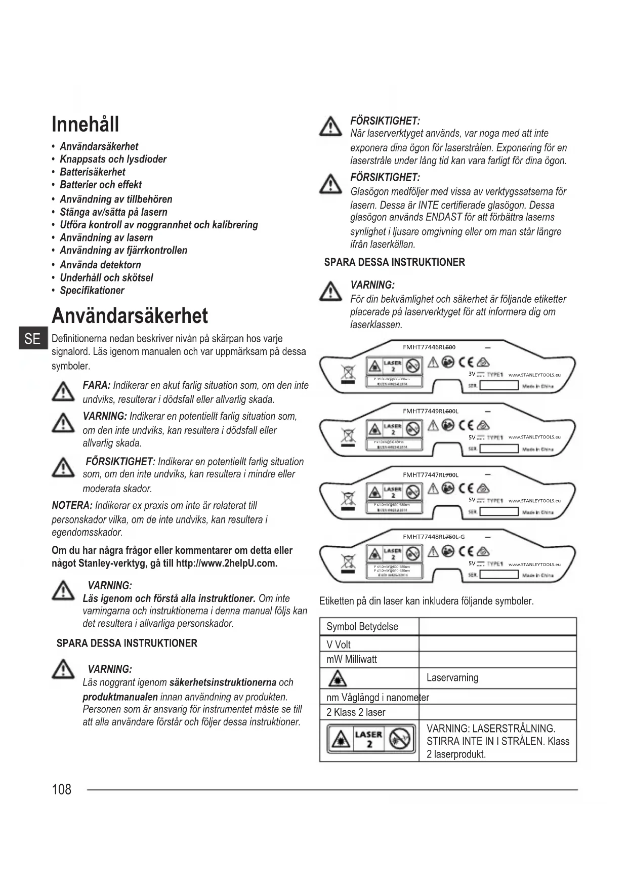 - Kalibreringskontroller och andra underhållsreparationer kan utföras av STANLEY servicecenter.118