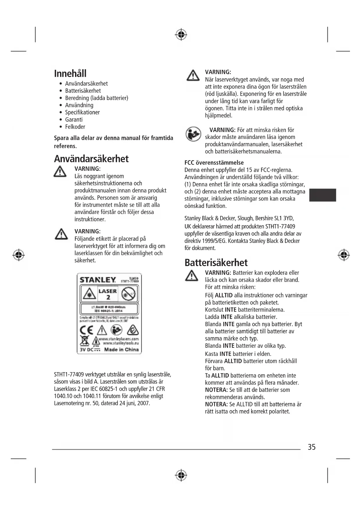 - Felkoder Spara alla delar av denna manual för framtida referens. Användarsäkerhet VARNING: Läs noggrant igenom säkerhetsinstruktionerna och produktmanualen innan denna produkt används. Personen som är ansvarig för instrumentet måste se till att alla användare förstår och följer dessa instruktioner. VARNING: Följande etikett är placerad på laserverktyget för att informera dig om laserklassen för din bekvämlighet och säkerhet. STHT1-77409 verktyget utstrålar en synlig laserstråle, såsom visas i bild A. Laserstrålen som utstrålas är Laserklass 2 per IEC 60825-1 och uppfyller 21 CFR 1040.10 och 1040.11 förutom för avvikelse enligt Lasernotering nr. 50, daterad 24 juni, 2007. VARNING: När laserverktyget används, var noga med att inte exponera dina ögon för laserstrålen (röd ljuskälla). Exponering för en laserstråle under lång tid kan vara farligt för ögonen. Titta inte in i strålen med optiska hjälpmedel. VARNING: För att minska risken för skador måste användaren läsa igenom produktanvändarmanualen, lasersäkerhet och batterisäkerhetsmanualerna. FCC överensstämmelse Denna enhet uppfyller del 15 av FCC-reglerna. Användningen är underställd följande två villkor: (1) Denna enhet får inte orsaka skadliga störningar, och (2) denna enhet måste acceptera alla mottagna störningar, inklusive störningar som kan orsaka oönskad funktion. Stanley Black & Decker, Slough, Bershire SL1 3YD, UK deklarerar härmed att produkten STHT1-77409 uppfyller de väsentliga kraven och alla andra delar av direktiv 1999/5/EG. Kontakta Stanley Black & Decker för dokument. Batterisäkerhet VARNING: Batterier kan explodera eller läcka och kan orsaka skador eller brand. För att minska risken: Följ ALLTID alla instruktioner och varningar på batterietiketten och paketet. Kortslut INTE batteriterminalerna. Ladda INTE alkaliska batterier. Blanda INTE gamla och nya batterier. Byt alla batterier samtidigt till batterier av samma märke och typ. Blanda INTE batterier av olika typ. Kasta INTE batterier i elden. Förvara ALLTID batterier utom räckhåll för barn. Ta ALLTID batterierna om enheten inte kommer att användas på era månader. NOTERA: Se till att de batterier som rekommenderas används. NOTERA: Se ALLTID till att batterierna är rätt isatta och med korrekt polaritet. 35Beredning (ladda batterier)