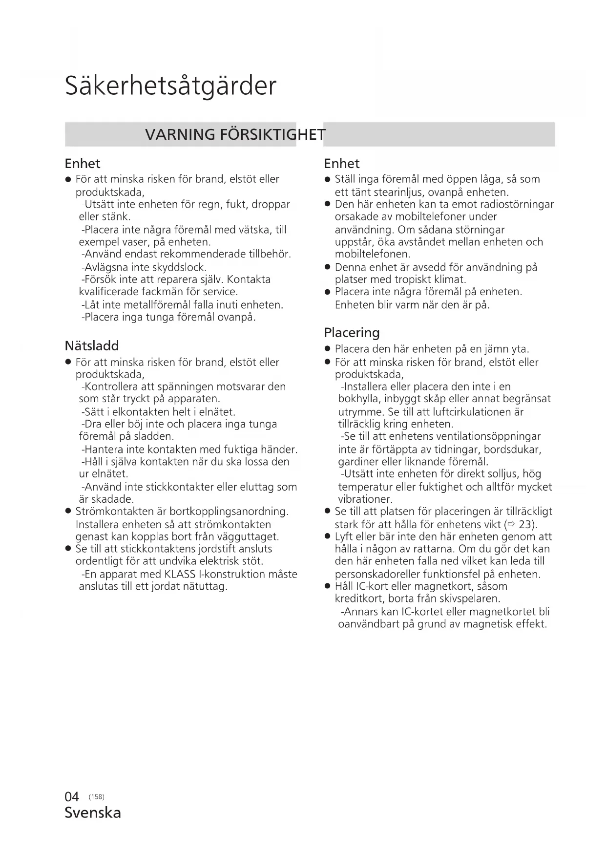 För att minska risken för brand, elstöt eller produktskada, -Utsätt inte enheten för regn, fukt, droppar eller stänk. -Placera inte några föremål med vätska, till exempel vaser, på enheten. -Använd endast rekommenderade tillbehör. -Avlägsna inte skyddslock. -Försök inte att reparera själv. Kontakta kvalificerade fackmän för service. -Låt inte metallföremål falla inuti enheten. -Placera inga tunga föremål ovanpå. Nätsladd